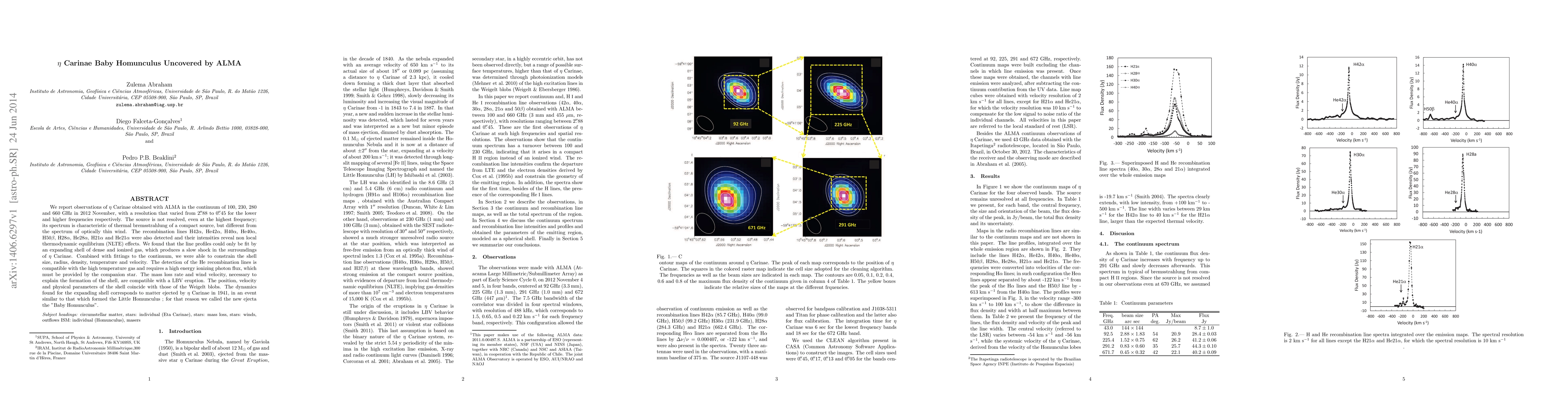We report observations of $\eta$ Carinae obtained with ALMA in the continuum of 100, 230, 280 and 660 GHz in 2012 November, with a resolution that varied from 2.88" to 0.45" for the lower and higher frequencies respectively. The source is not resolved, even at the highest frequency; its spectrum is characteristic of thermal bremsstrahlung of a compact source, but different from the spectrum of optically thin wind. The recombination lines H42$\alpha$, He42$\alpha$, H40$\alpha$, He40$\alpha$, H50$\beta$, H28$\alpha$, He28$\alpha$, H21$\alpha$ and He21$\alpha$ were also detected and their intensities reveal non local thermodynamic equilibrium (NLTE) effects. We found that the line profiles could only be fit by an expanding shell of dense and ionized gas, which produces a slow shock in the surroundings of $\eta$ Carinae. Combined with fittings to the continuum, we were able to constrain the shell size, radius, density, temperature and velocity. The detection of the He recombination lines is compatible with the high temperature gas and requires a high energy ionizing photon flux, which must be provided by the companion star. The mass loss rate and wind velocity, necessary to explain the formation of the shell, are compatible with a LBV eruption. The position, velocity and physical parameters of the shell coincide with those of the Weigelt blobs. The dynamics found for the expanding shell corresponds to matter ejected by $\eta$ Carinae in 1941, in an event similar to that which formed the Little Homunculus ; for that reason we called the new ejecta the "Baby Homunculus".