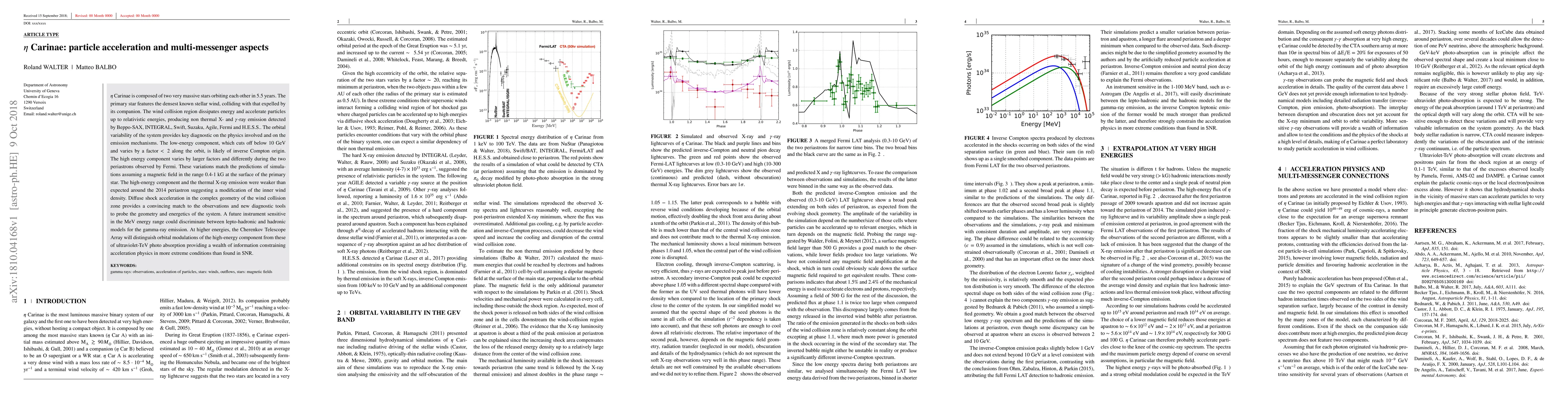 $\eta$ Carinae is composed of two very massive stars orbiting each other in 5.5 years. The primary star features the densest known stellar wind, colliding with that expelled by its companion. The wind collision region dissipates energy and accelerate particles up to relativistic energies, producing non thermal X- and $\gamma$-ray emission detected by Beppo-SAX, INTEGRAL, Swift, Suzaku, Agile, Fermi and H.E.S.S.. The orbital variability of the system provides key diagnostic on the physics involved and on the emission mechanisms. The low-energy component, which cuts off below 10 GeV and varies by a factor < 2 along the orbit, is likely of inverse Compton origin. The high energy component varies by larger factors and differently during the two periastrons observed by Fermi. These variations match the predictions of simula- tions assuming a magnetic field in the range 0.4-1 kG at the surface of the primary star. The high-energy component and the thermal X-ray emission were weaker than expected around the 2014 periastron suggesting a modification of the inner wind density. Diffuse shock acceleration in the complex geometry of the wind collision zone provides a convincing match to the observations and new diagnostic tools to probe the geometry and energetics of the system. A future instrument sensitive in the MeV energy range could discriminate between lepto-hadronic and hadronic models for the gamma-ray emission. At higher energies, the Cherenkov Telescope Array will distinguish orbital modulations of the high-energy component from these of ultraviolet-TeV photo absorption providing a wealth of information constraining acceleration physics in more extreme conditions than found in SNR.