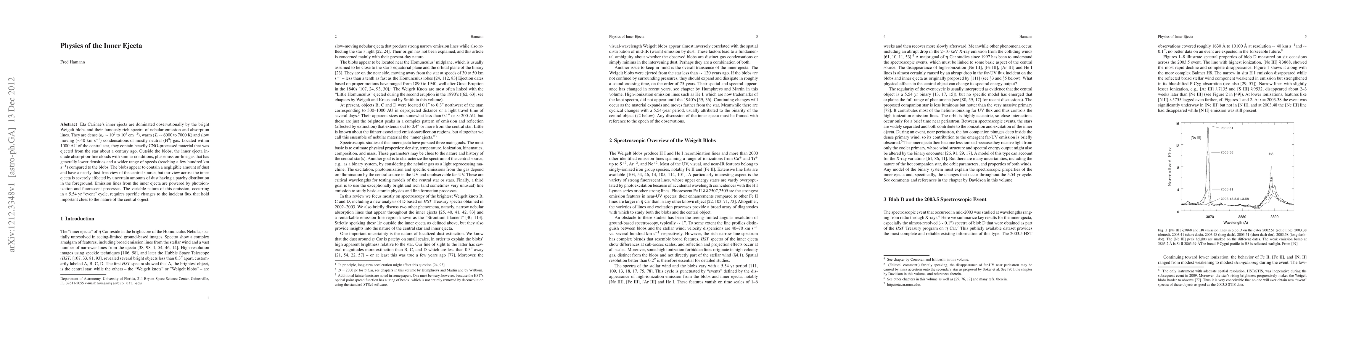Eta Carinae's inner ejecta are dense, warm, and slow-moving gas clouds that contain CNO-processed material ejected from the star about a century ago, with emission lines powered by photoionization and fluorescent processes.