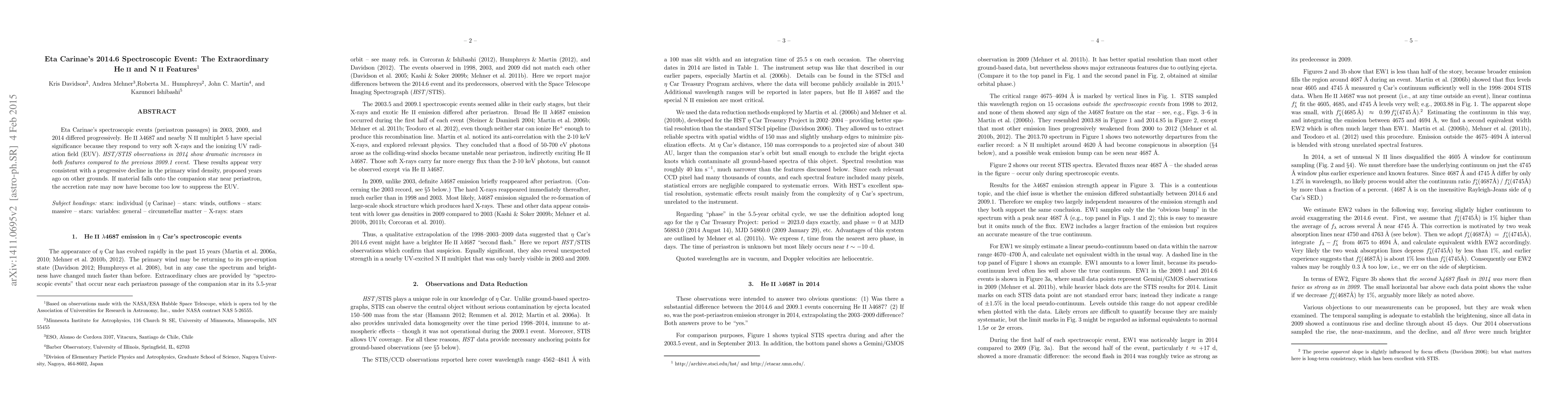 Eta Carinae's spectroscopic events (periastron passages) in 2003, 2009, and 2014 differed progressively. He II 4687 and nearby N II multiplet 5 have special significance because they respond to very soft X-rays and the ionizing UV radiation field (EUV). HST/STIS observations in 2014 show dramatic increases in both features compared to the previous 2009.1 event. These results appear very consistent with a progressive decline in the primary wind density, proposed years ago on other grounds. If material falls onto the companion star near periastron, the accretion rate may now have become too low to suppress the EUV