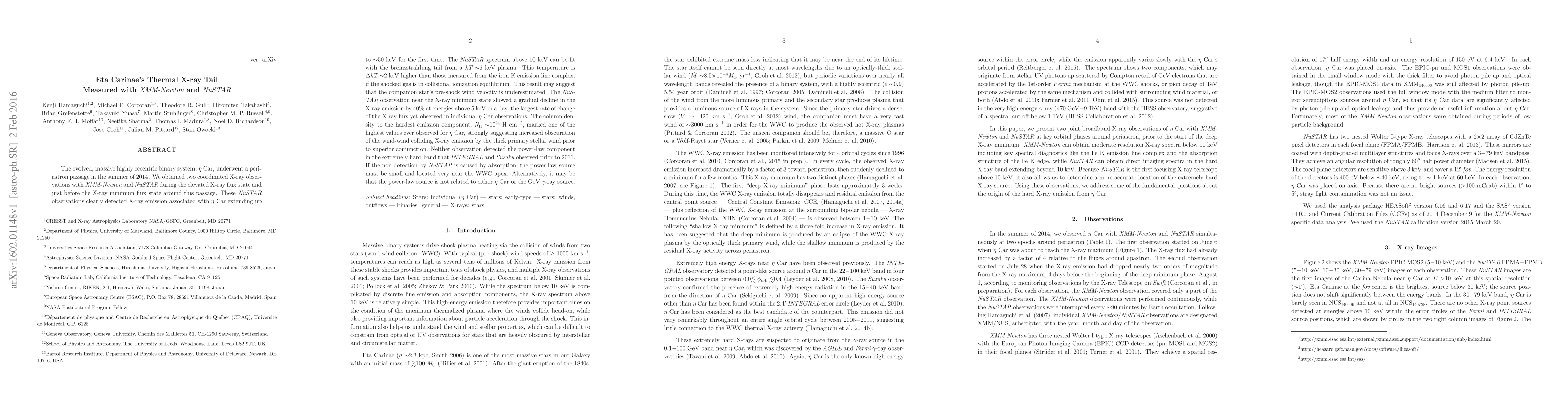 The evolved, massive highly eccentric binary system, eta Carinae, underwent a periastron passage in the summer of 2014. We obtained two coordinated X-ray observations with XMM-Newton and NuSTAR during the elevated X-ray flux state and just before the X-ray minimum flux state around this passage. These NuSTAR observations clearly detected X-ray emission associated with eta Car extending up to ~50 keV for the first time. The NuSTAR spectrum above 10 keV can be fit with the bremsstrahlung tail from a kT ~6 keV plasma. This temperature is Delta kT ~2 keV higher than those measured from the iron K emission line complex, if the shocked gas is in collisional ionization equilibrium. This result may suggest that the companion star's pre-shock wind velocity is underestimated. The NuSTAR observation near the X-ray minimum state showed a gradual decline in the X-ray emission by 40% at energies above 5 keV in a day, the largest rate of change of the X-ray flux yet observed in individual eta Car observations. The column density to the hardest emission component, NH ~1e24 cm-2, marked one of the highest values ever observed for eta Car, strongly suggesting increased obscuration of the wind-wind colliding X-ray emission by the thick primary stellar wind prior to superior conjunction. Neither observation detected the power-law component in the extremely hard band that INTEGRAL and Suzaku observed prior to 2011. If the non-detection by NuSTAR is caused by absorption, the power-law source must be small and located very near the WWC apex. Alternatively, it may be that the power-law source is not related to either eta Car or the GeV gamma-ray source.