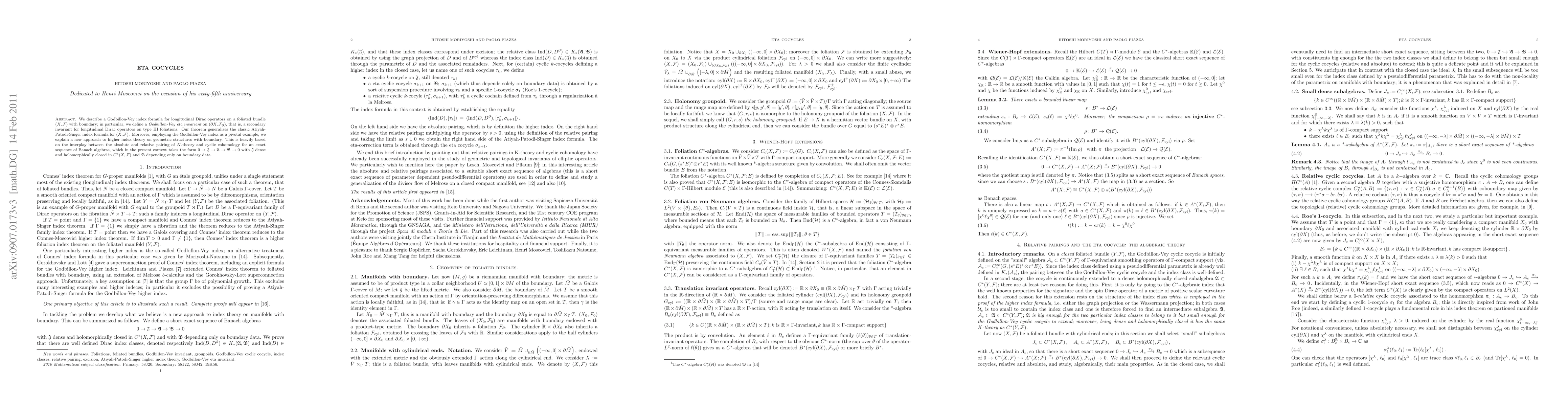 We announce a Godbillon-Vey index formula for longitudinal Dirac operators on a foliated bundle $(X,\F)$ with boundary; in particular, we define a Godbillon-Vey eta invariant on the boundary foliation, that is, a secondary invariant for longitudinal Dirac operators on type III foliations. Our theorem generalizes the classic Atiyah-Patodi-Singer index formula for $(X,\F)$. Moreover, employing the Godbillon-Vey index as a pivotal example, we explain a new approach to higher index theory on geometric structures with boundary. This is heavily based on the interplay between the absolute and relative pairing of $K$-theory and cyclic cohomology for an exact sequence of Banach algebras, which in the present context takes the form $0\to J \to A \to B \to 0$ with J dense and holomorphically closed in the C^*-algebra of the foliation and B depending only on boundary data.