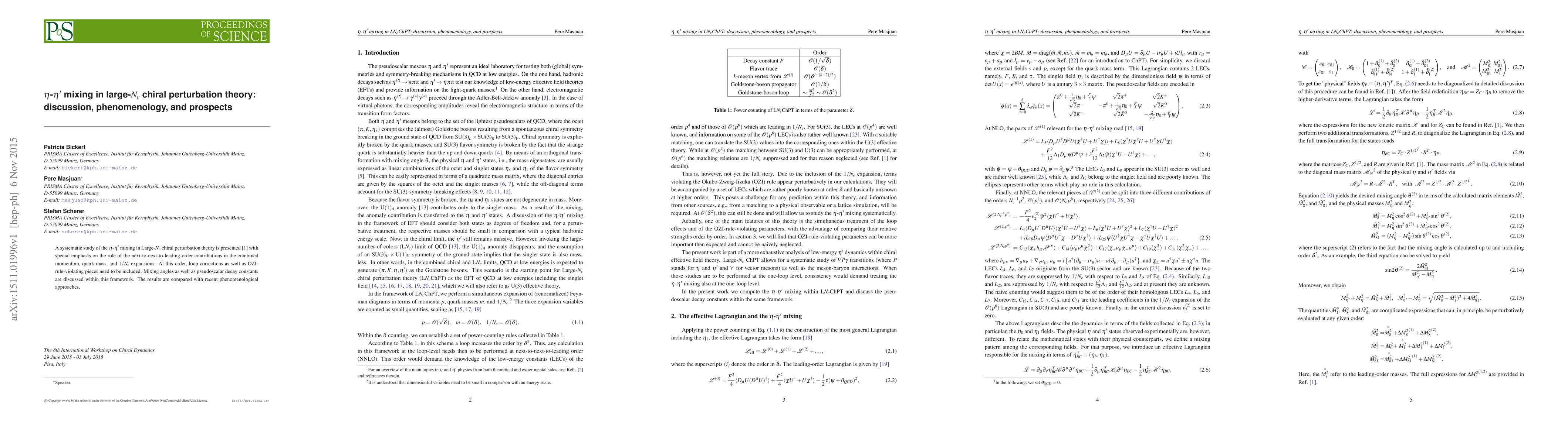 A systematic study of the $\eta$-$\eta'$ mixing in Large-$N_c$ chiral perturbation theory is presented with special emphasis on the role of the next-to-next-to-leading-order contributions in the combined momentum, quark-mass, and $1/N_c$ expansions. At this order, loop corrections as well as OZI-rule-violating pieces need to be included. Mixing angles as well as pseudoscalar decay constants are discussed within this framework. The results are compared with recent phenomenological approaches.