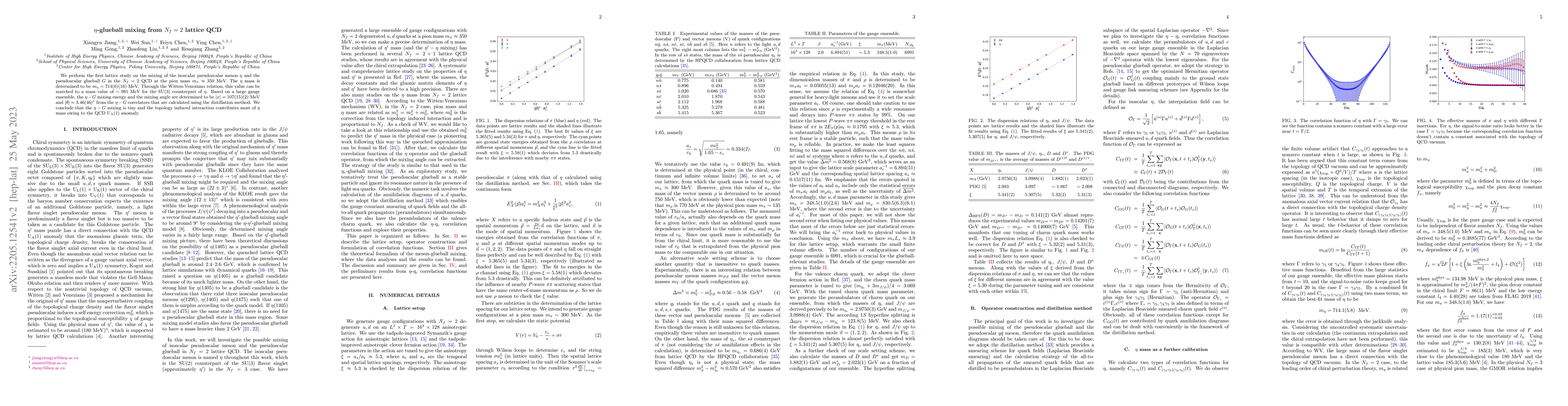 This study investigates the mixing between the $\eta$ meson and the pseudoscalar glueball in $N_f=2$ lattice QCD at a pion mass of approximately 350 MeV. The $\eta$ mass is found to be 714(6)(16) MeV, and the $\eta-G$ mixing energy and angle are determined to be small, indicating minimal mixing and a dominant role of the $\mathrm{U_A(1)}$ anomaly in the $\eta$ mass.