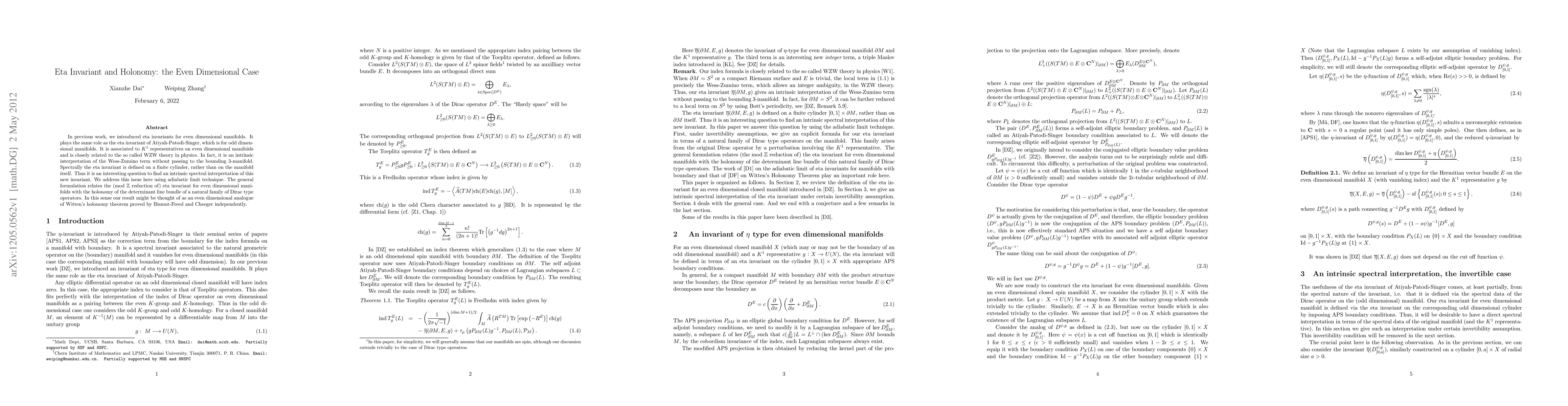 This paper explores the intrinsic spectral interpretation of eta invariants for even dimensional manifolds, linking them to the holonomy of determinant line bundles associated with Dirac type operators, and positions this as an even-dimensional counterpart to Witten's holonomy theorem.