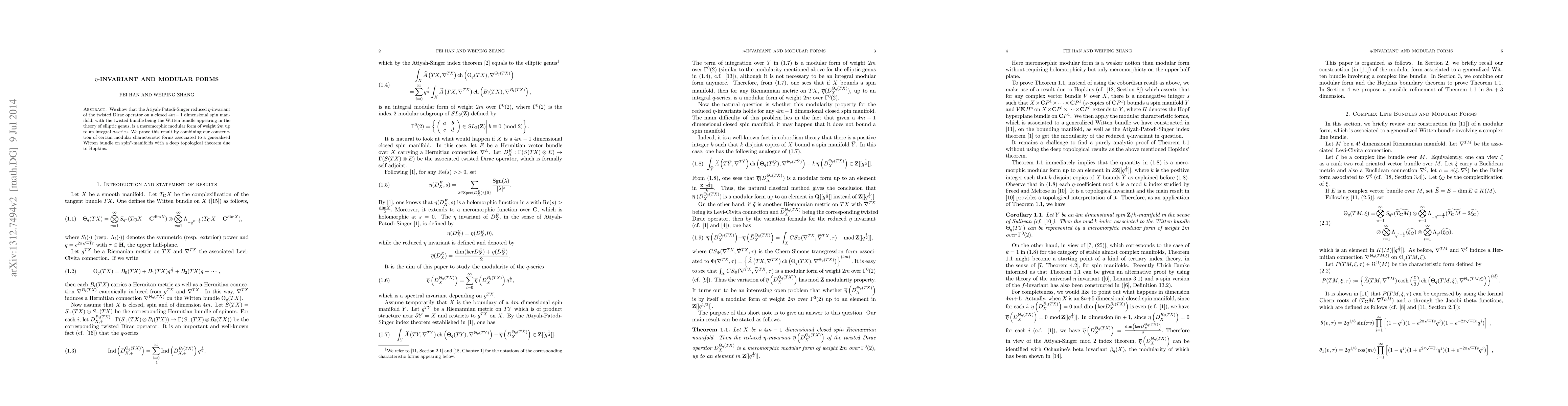 The paper demonstrates that the Atiyah-Patodi-Singer reduced $\eta$-invariant for a twisted Dirac operator on a specific spin manifold is a meromorphic modular form of weight $2m$, using a combination of modular characteristic forms and a topological theorem by Hopkins.