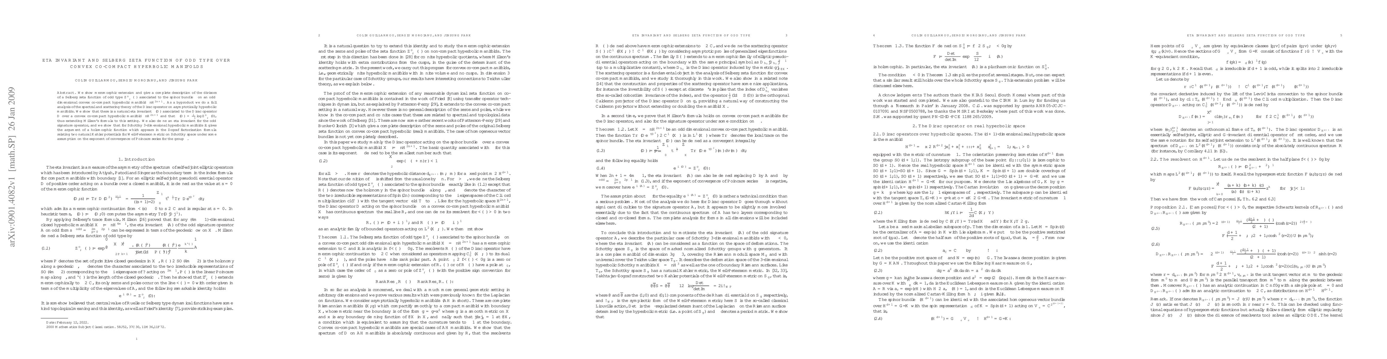 This paper extends Millson's formula to odd dimensional convex co-compact hyperbolic manifolds by analyzing the meromorphic extension and divisors of a Selberg zeta function, defining a natural eta invariant associated with the Dirac operator, and establishing a connection between this invariant and the zeta function's logarithmic value.