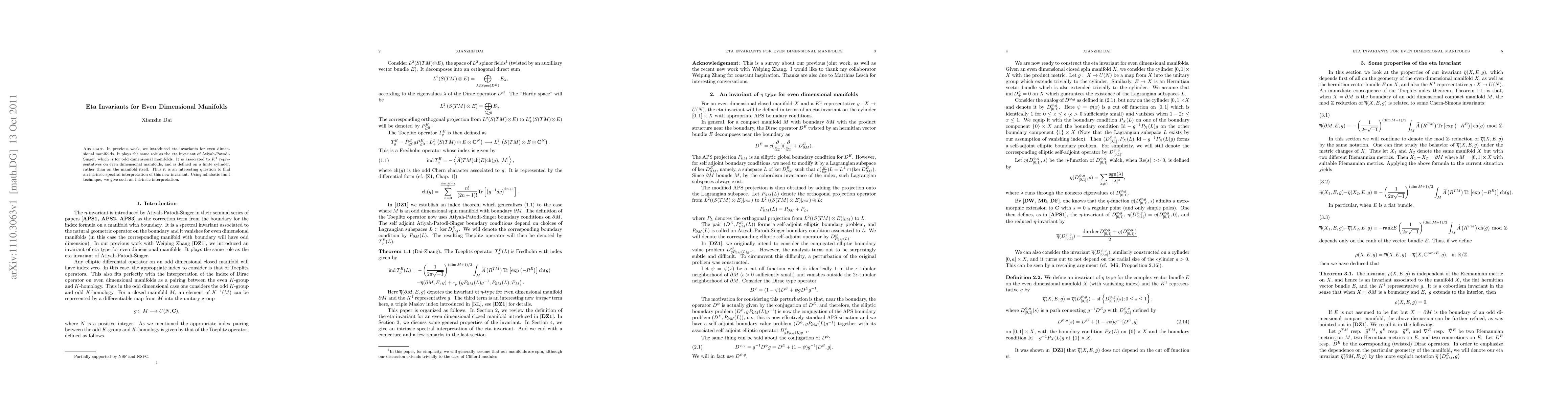 The paper introduces eta invariants for even dimensional manifolds, analogous to the eta invariant for odd dimensional manifolds, and provides an intrinsic spectral interpretation using adiabatic limit techniques.
