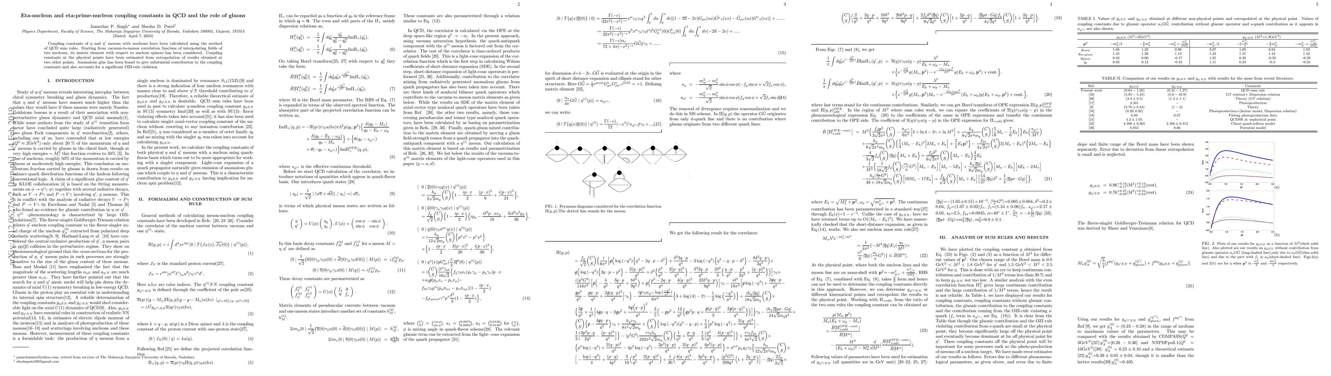 This research calculates the coupling constants of $\eta$ and $\eta^{\prime}$ mesons with nucleons using QCD sum rules, finding substantial contributions from anomalous glue and significant OZI-rule violations. The study extrapolates results from non-physical points to estimate the constants at physical conditions.