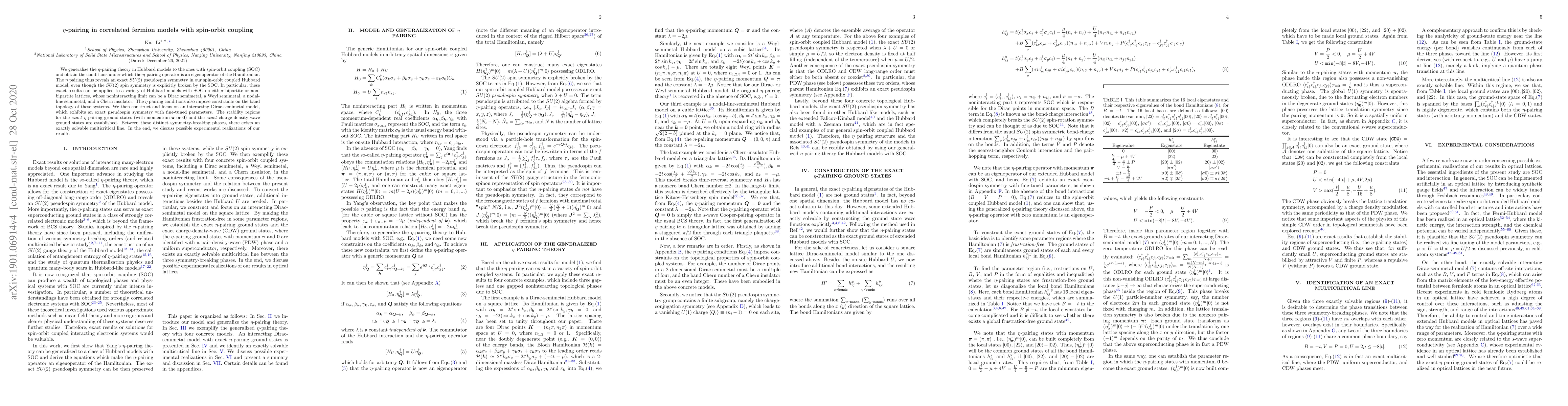The generalization of η-pairing theory to include SOC, the identification of conditions for the η-pairing operator as an eigenoperator, and the revelation of an exact SU(2) pseudospin symmetry in SOC Hubbard models.