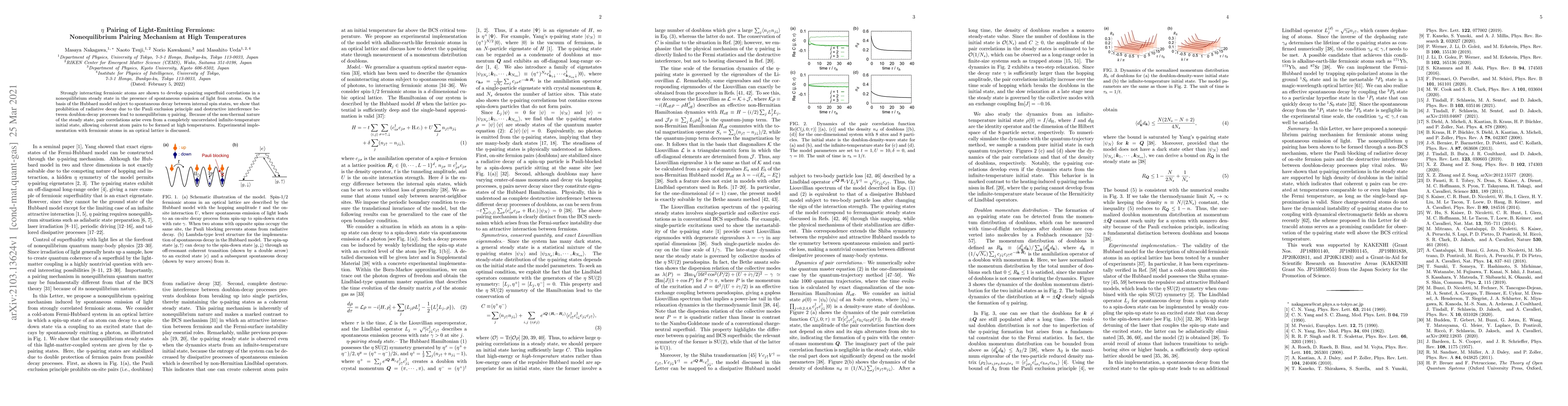 This paper demonstrates that strongly interacting fermionic atoms can develop $\eta$-pairing superfluid correlations in a nonequilibrium steady state due to light emission. The study reveals that the Pauli exclusion principle and interference effects lead to nonequilibrium $\eta$ pairing, enabling coherent atom pairs to form even at high temperatures.