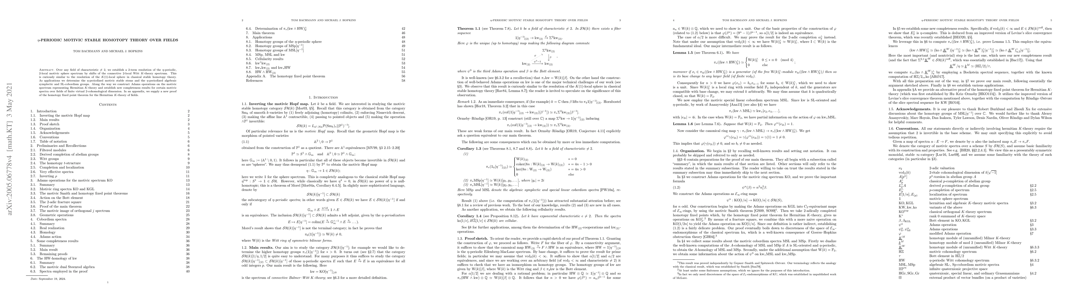 Over any field of characteristic not 2, we establish a 2-term resolution of the $\eta$-periodic, 2-local motivic sphere spectrum by shifts of the connective 2-local Witt K-theory spectrum. This is curiously similar to the resolution of the K(1)-local sphere in classical stable homotopy theory. As applications we determine the $\eta$-periodized motivic stable stems and the $\eta$-periodized algebraic symplectic and SL-cobordism groups. Along the way we construct Adams operations on the motivic spectrum representing Hermitian K-theory and establish new completeness results for certain motivic spectra over fields of finite virtual 2-cohomological dimension. In an appendix, we supply a new proof of the homotopy fixed point theorem for the Hermitian K-theory of fields.