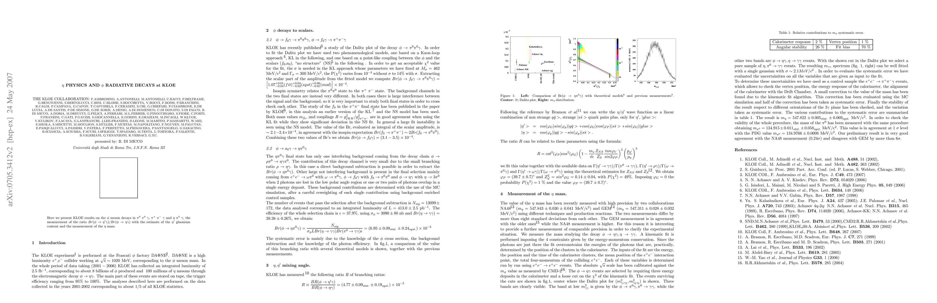 KLOE experiment measured phi meson decays into pi0 pi0 gamma, pi+ pi- gamma, and eta pi0 gamma. It also determined the ratio Br(phi to eta' gamma)/Br(phi to eta gamma), providing insights into eta' gluonium content and measured the eta mass.