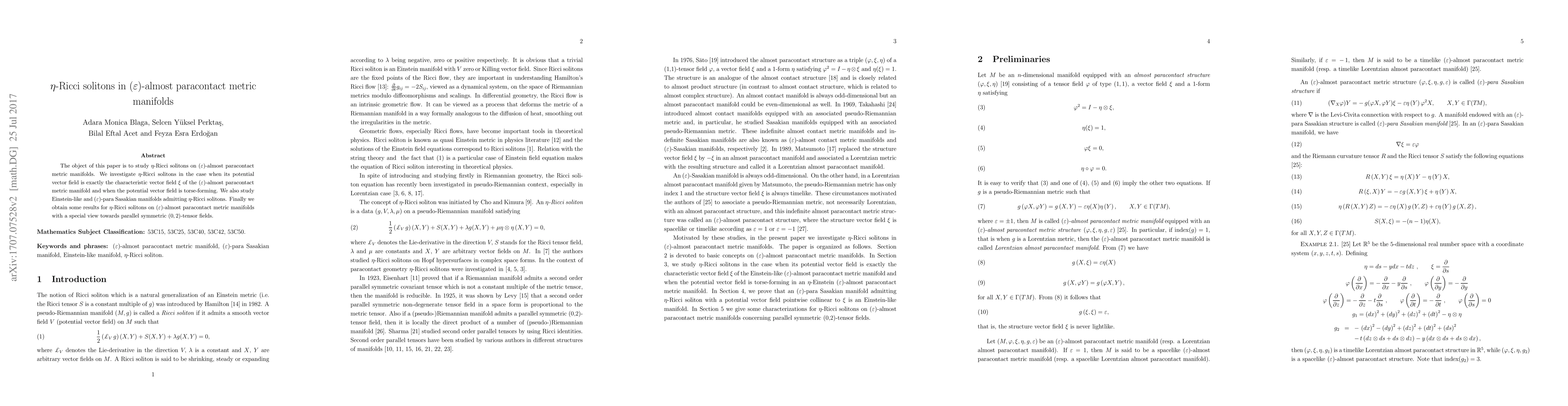 This paper explores $\eta$-Ricci solitons in $(\varepsilon)$-almost paracontact metric manifolds, focusing on cases where the potential vector field aligns with the characteristic vector field $\xi$ or is torse-forming. It also examines Einstein-like and $(\varepsilon)$-para Sasakian manifolds with $\eta$-Ricci solitons and discusses implications for parallel symmetric (0,2)-tensor fields.