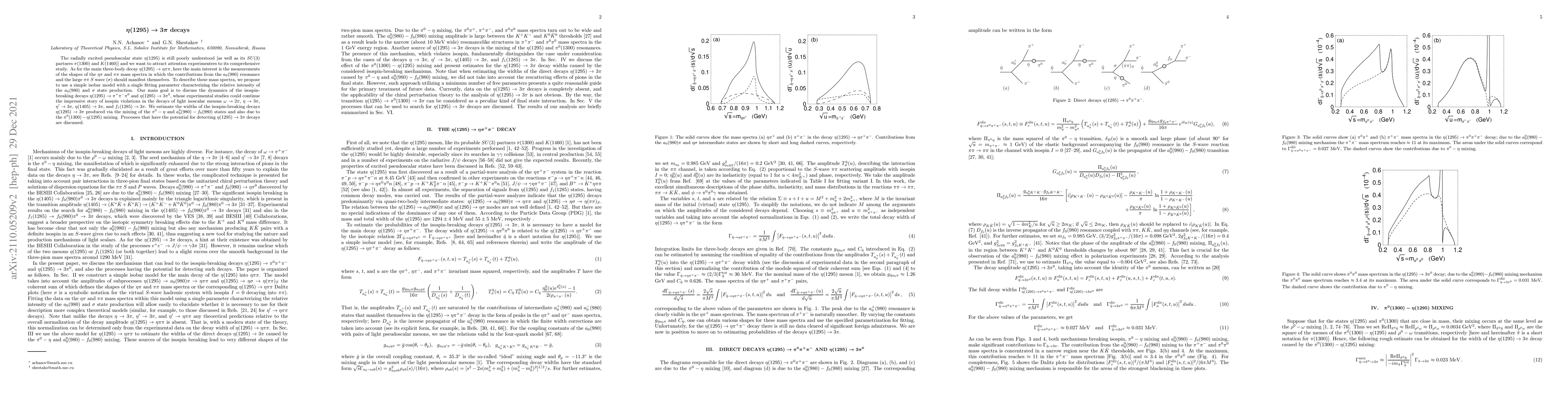 This paper explores the poorly understood $\eta(1295)$ meson and its isospin-breaking decays into three pions, proposing an isobar model to describe the mass spectra of its main decay $\eta(1295)\to \eta\pi\pi$. It estimates the widths of the $\eta(1295)\to3\pi$ decays and discusses potential experimental processes for detection.
