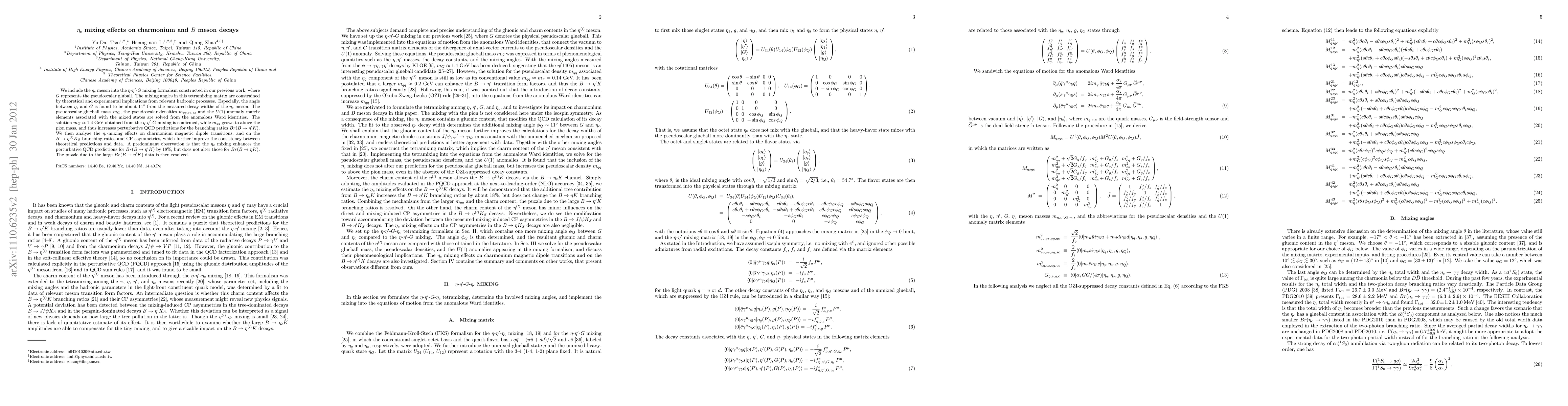 We include the $\eta_c$ meson into the $\eta$-$\eta'$-$G$ mixing formalism constructed in our previous work, where $G$ represents the pseudoscalar gluball. The mixing angles in this tetramixing matrix are constrained by theoretical and experimental implications from relevant hadronic processes. Especially, the angle between $\eta_c$ and $G$ is found to be about $11^\circ$ from the measured decay widths of the $\eta_c$ meson. The pseudoscalar glueball mass $m_G$, the pseudoscalar densities $m_{qq,ss,cc}$ and the U(1) anomaly matrix elements associated with the mixed states are solved from the anomalous Ward identities. The solution $m_G\approx 1.4$ GeV obtained from the $\eta$-$\eta'$-$G$ mixing is confirmed, while $m_{qq}$ grows to above the pion mass, and thus increases perturbative QCD predictions for the branching ratios $Br(B\to\eta'K)$. We then analyze the $\eta_c$-mixing effects on charmonium magnetic dipole transitions, and on the $B\to\eta^{(\prime)}K_S$ branching ratios and CP asymmetries, which further improve the consistency between theoretical predictions and data. A predominant observation is that the $\eta_c$ mixing enhances the perturbative QCD predictions for $Br(B\to\eta'K)$ by 18%, but does not alter those for $Br(B\to\eta K)$. The puzzle due to the large $Br(B\to\eta'K)$ data is then resolved.