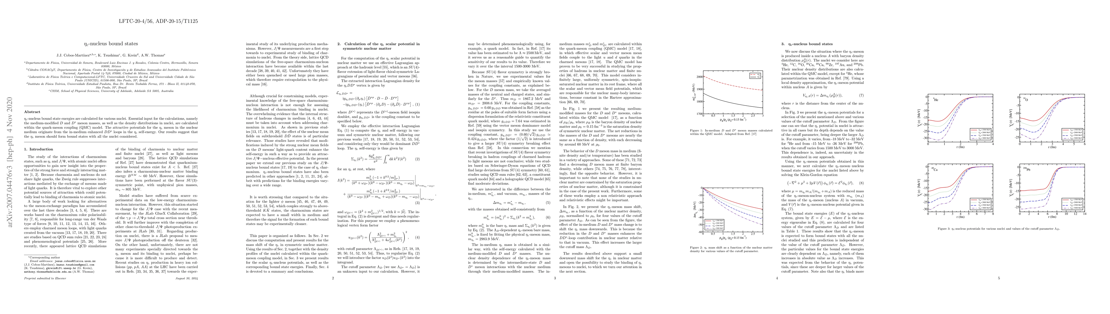 $\eta_c$-nucleus bound state energies are calculated for various nuclei. Essential input for the calculations, namely the medium-modified $D$ and $D^{*}$ meson masses, as well as the density distributions in nuclei, are calculated within the quark-meson coupling (QMC) model. The attractive potentials for the $\eta_c$ meson in the nuclear medium originate from the in-medium enhanced $DD^{*}$ loops in the $\eta_c$ self-energy. Our results suggest that the $\eta_c$ meson should form bound states with all the nuclei considered.