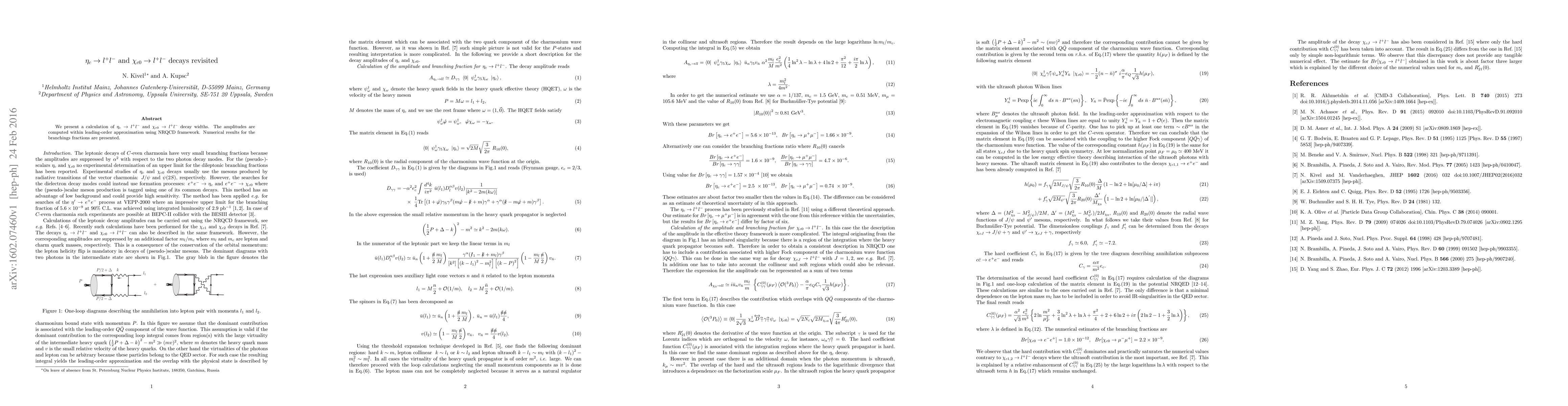 We present a calculation of $\eta_{c}\rightarrow l^{+}l^{-}$ and $\chi_{c0}\rightarrow l^{+}l^{-}$ decay widths. The amplitudes are computed within leading-order approximation using NRQCD framework. Numerical results for the branchings fractions are presented.