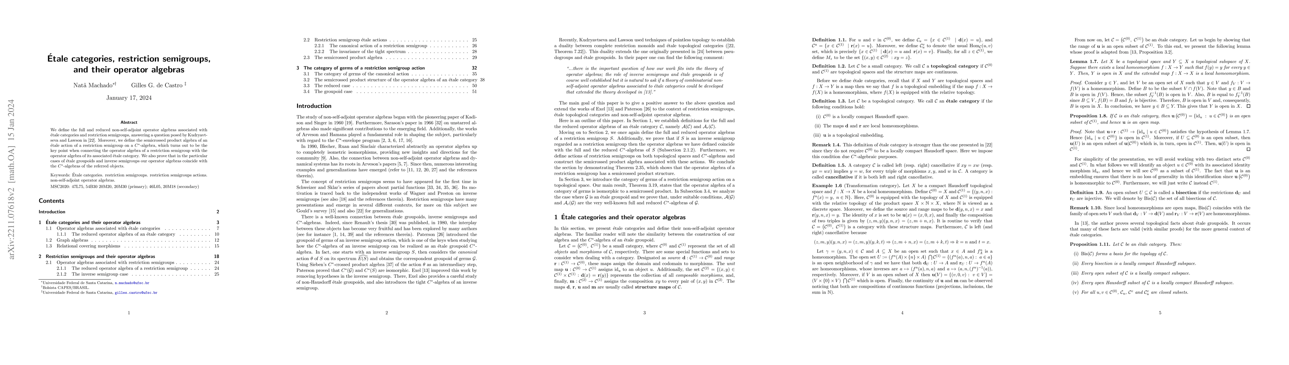 This paper defines full and reduced operator algebras for \'etale categories and restriction semigroups, addressing a question by Kudryavtseva and Lawson. It introduces the semicrossed product algebra for \'etale actions, establishing connections between operator algebras of restriction semigroups and their associated \'etale categories, and proves coincidence with $C^*$-algebras in cases of \'etale groupoids and inverse semigroups.