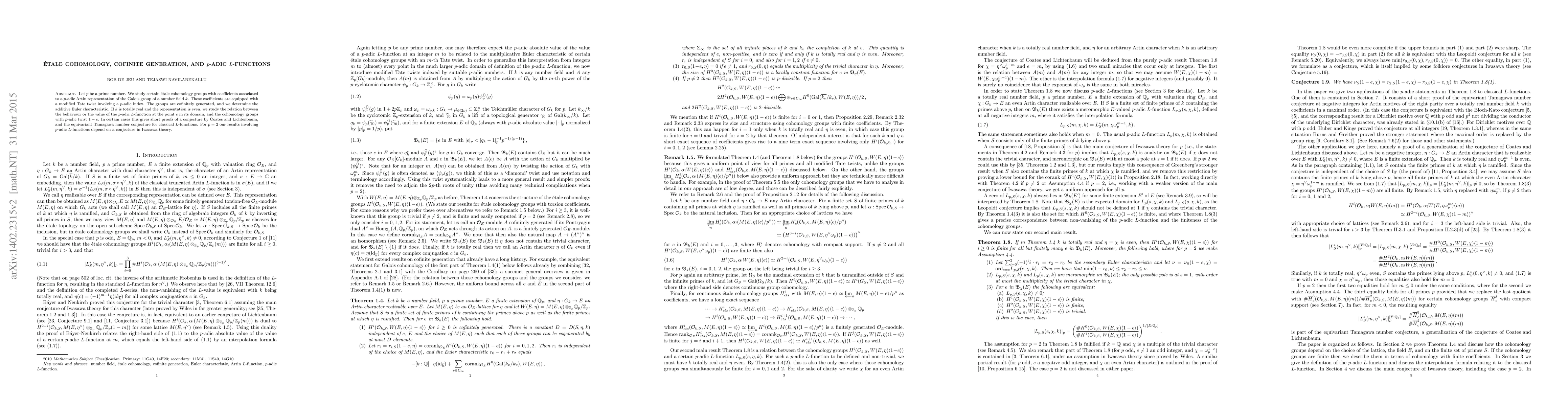 This paper investigates etale cohomology groups associated with p-adic Artin representations, proving their cofinite generation and computing Euler characteristics. It links the vanishing order of p-adic L-functions to the corank of these cohomology groups, and provides proofs for conjectures by Coates and Lichtenbaum, as well as the equivariant Tamagawa number conjecture for classical L-functions.