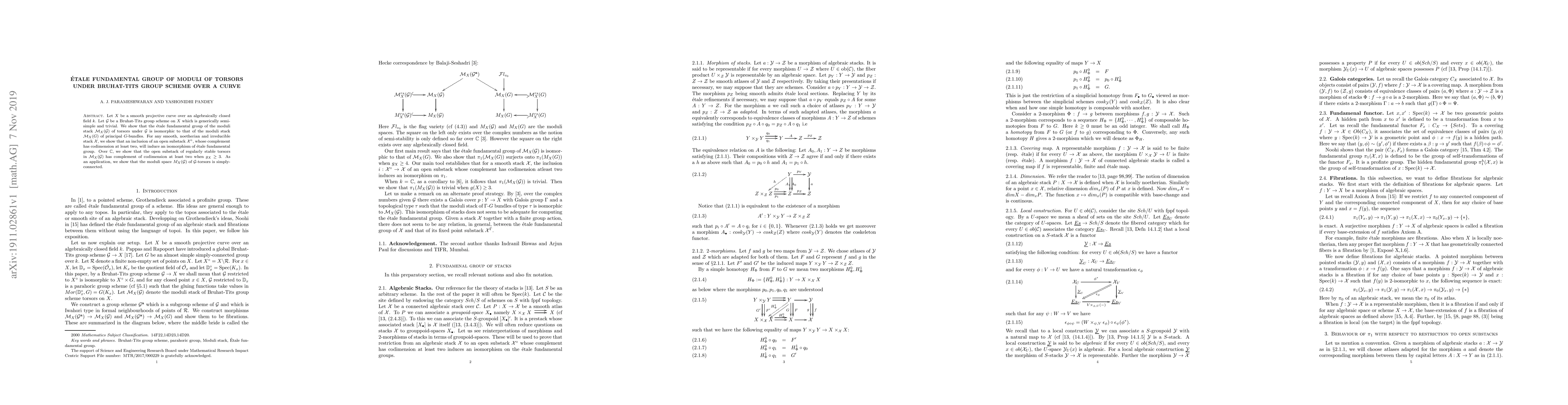 Let $X$ be a smooth projective curve over an algebraically closed field $k$. Let $\mathcal{G}$ be a Bruhat-Tits group scheme on $X$ which is generically semi-simple and trivial. We show that the \'etale fundamental group of the moduli stack $\mathcal{M}_X(\mathcal{G})$ of torsors under $\mathcal{G}$ is isomorphic to that of the moduli stack $\mathcal{M}_X(G)$ of principal $G$-bundles. For any smooth, noetherian and irreducible stack $\mathcal{X}$, we show that an inclusion of an open substack $\mathcal{X}^\circ$, whose complement has codimension at least two, will induce an isomorphism of \'etale fundamental group. Over $\mathbb{C}$, we show that the open substack of regularly stable torsors in $\mathcal{M}_X(\mathcal{G})$ has complement of codimension at least two when $g_X \geq 3$. As an application, we show that the moduli space $M_X(\mathcal{G})$ of $\mathcal{G}$-torsors is simply-connected.