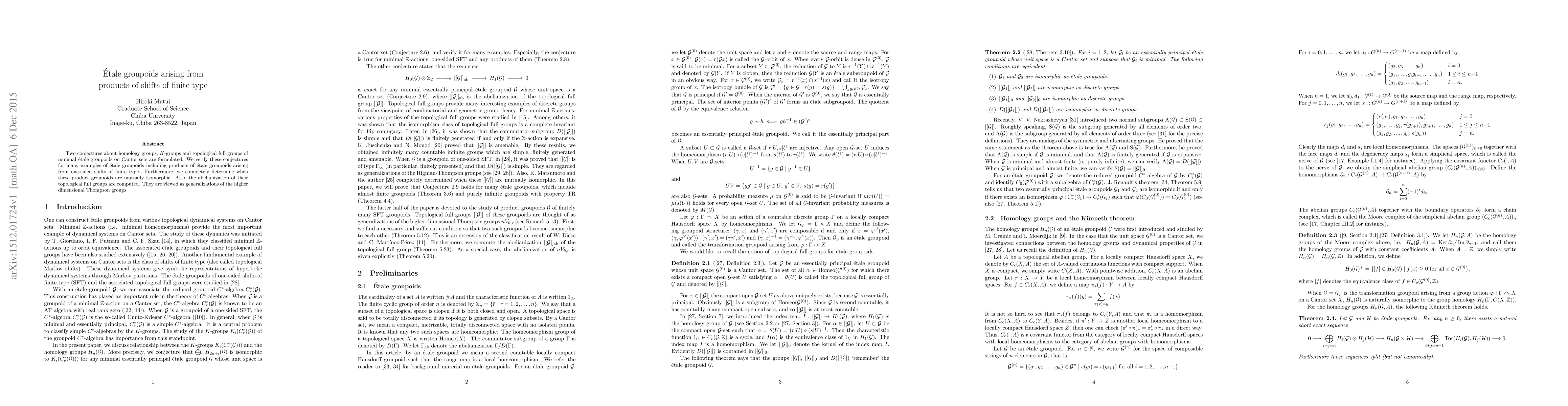 Two conjectures about homology groups, K-groups and topological full groups of minimal etale groupoids on Cantor sets are formulated. We verify these conjectures for many examples of etale groupoids including products of etale groupoids arising from one-sided shifts of finite type. Furthermore, we completely determine when these product groupoids are mutually isomorphic. Also, the abelianization of their topological full groups are computed. They are viewed as generalizations of the higher dimensional Thompson groups.