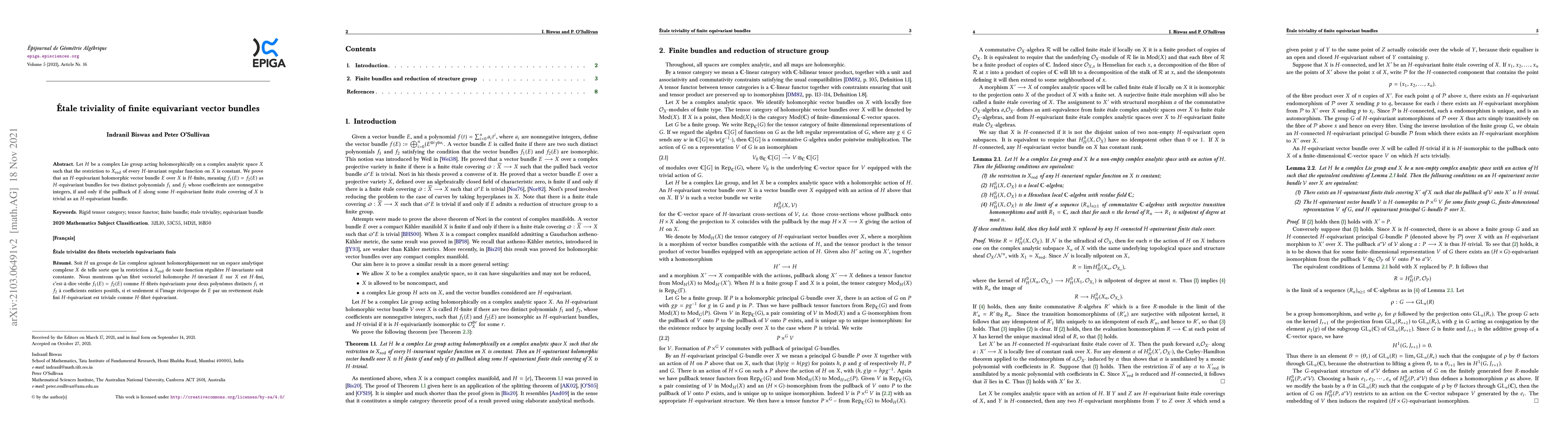 This paper proves that a finite equivariant vector bundle over a complex analytic space with a specific holomorphic group action is $H$-finite if and only if its pullback along some finite \'etale covering becomes trivial as an $H$-equivariant bundle. The authors establish conditions for \'etale triviality of such vector bundles.