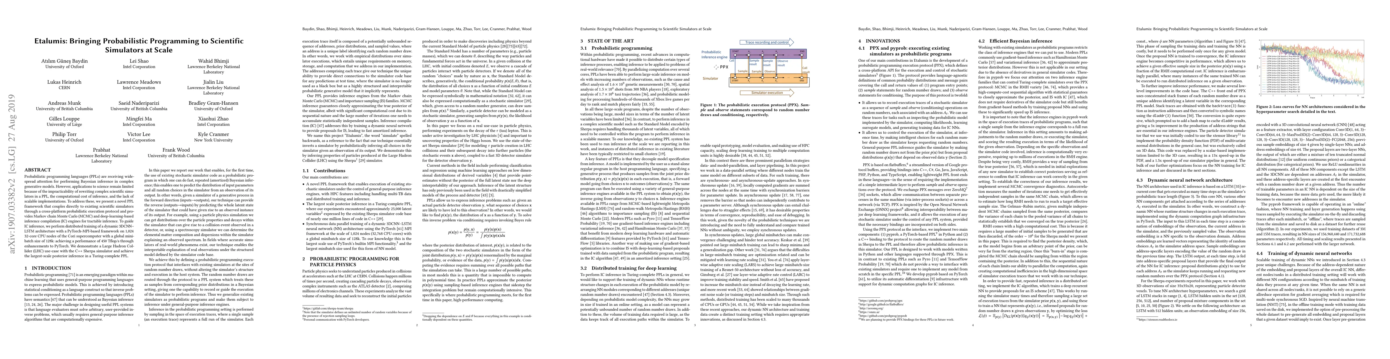 Etalumis introduces a probabilistic programming framework that integrates directly with existing scientific simulators, enabling scalable Bayesian inference without requiring simulator rewrites. It employs MCMC and deep-learning-based inference compilation, achieving high-performance distributed training on supercomputers for large-scale posterior inference.