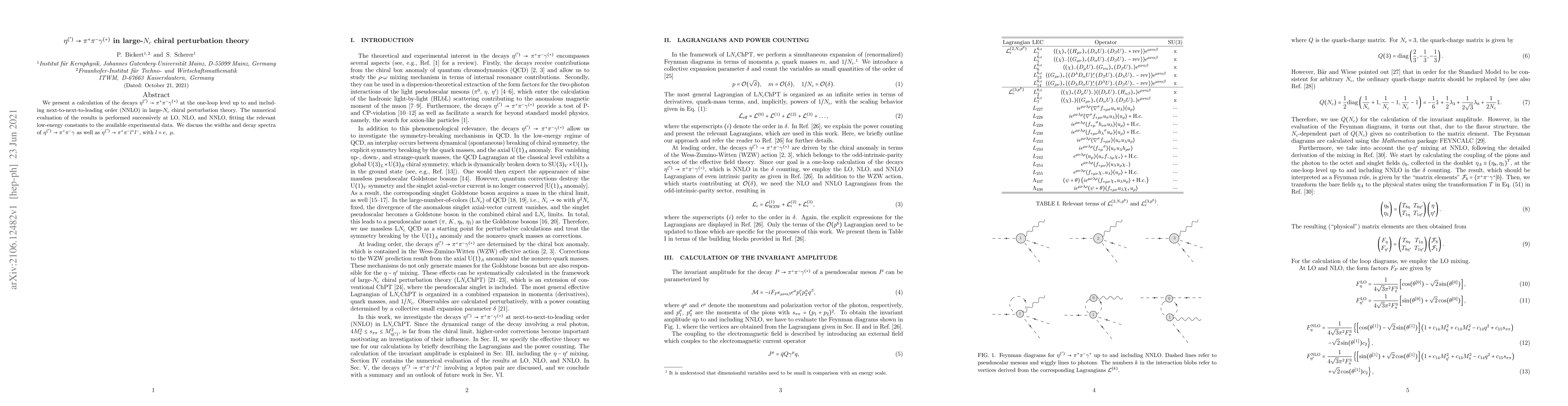 This paper calculates the decay processes $\eta^{(')}\to\pi^+\pi^-\gamma^{(\ast)}$ up to next-to-next-to-leading order in large-$N_c$ chiral perturbation theory, evaluating the results at LO, NLO, and NNLO and fitting low-energy constants to experimental data. It discusses the decay widths and spectra for both $\eta^{(')}\to\pi^+\pi^-\gamma$ and $\eta^{(')}\to\pi^+\pi^-l^+l^-$ with $l=e,\ \mu$.