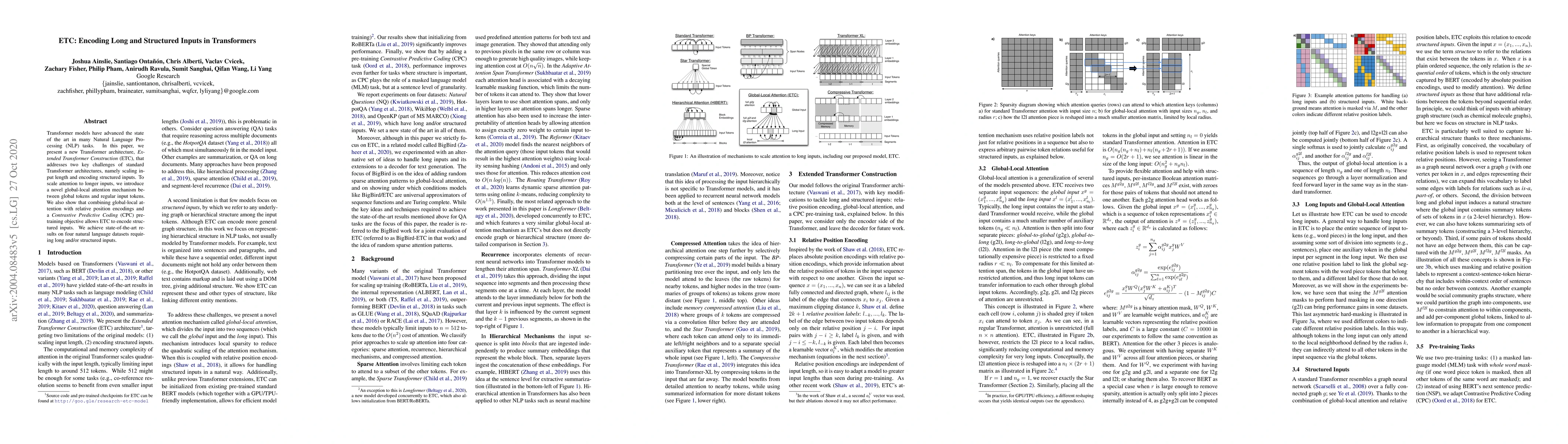 Transformer models have advanced the state of the art in many Natural Language Processing (NLP) tasks. In this paper, we present a new Transformer architecture, Extended Transformer Construction (ETC), that addresses two key challenges of standard Transformer architectures, namely scaling input length and encoding structured inputs. To scale attention to longer inputs, we introduce a novel global-local attention mechanism between global tokens and regular input tokens. We also show that combining global-local attention with relative position encodings and a Contrastive Predictive Coding (CPC) pre-training objective allows ETC to encode structured inputs. We achieve state-of-the-art results on four natural language datasets requiring long and/or structured inputs.