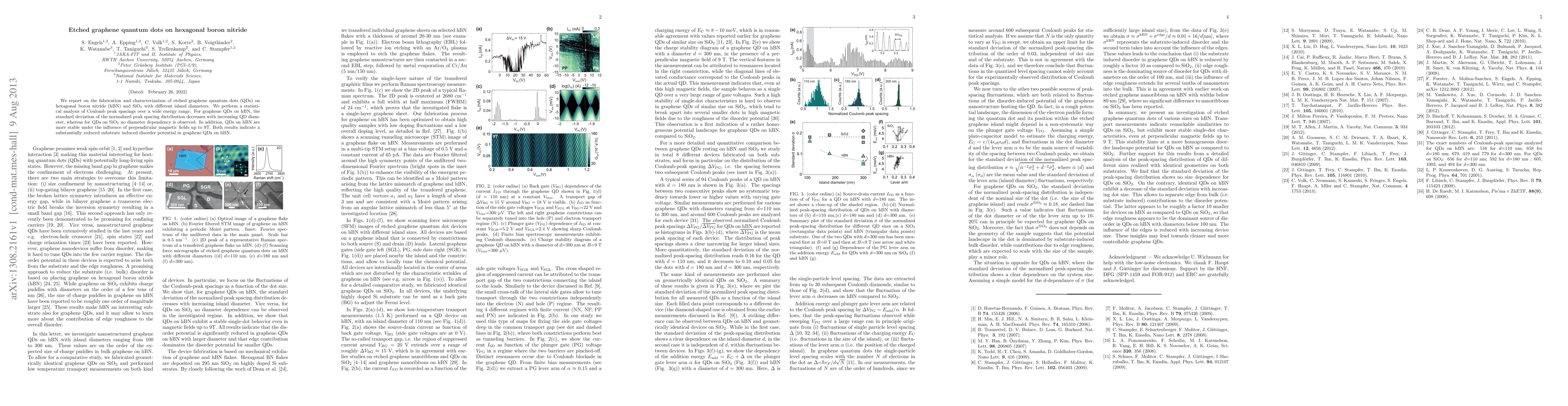 This paper describes the fabrication of etched graphene quantum dots on hexagonal boron nitride and SiO2, showing reduced disorder potential in QDs on hBN. Graphene QDs on hBN exhibit a diameter-dependent decrease in Coulomb peak spacing standard deviation and greater stability under magnetic fields.