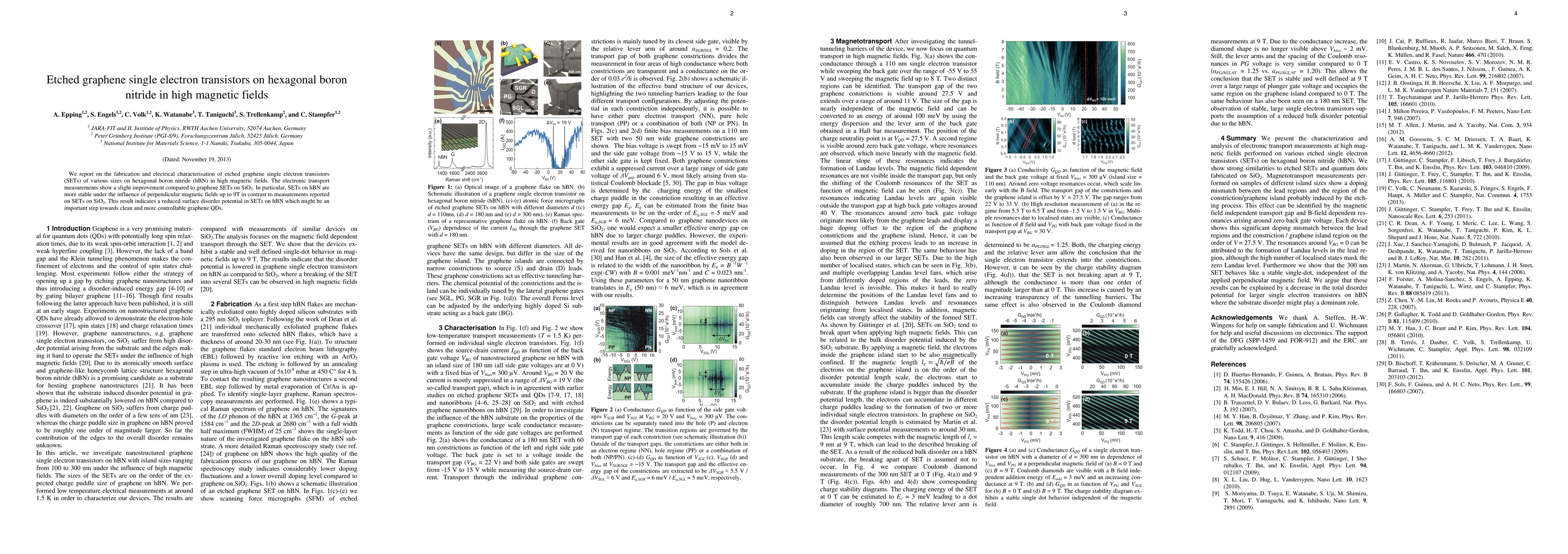 The study fabricates and characterizes etched graphene single electron transistors on hexagonal boron nitride (hBN) in high magnetic fields, showing improved stability and reduced surface disorder potential compared to those on SiO2, suggesting enhanced performance for graphene quantum dots.
