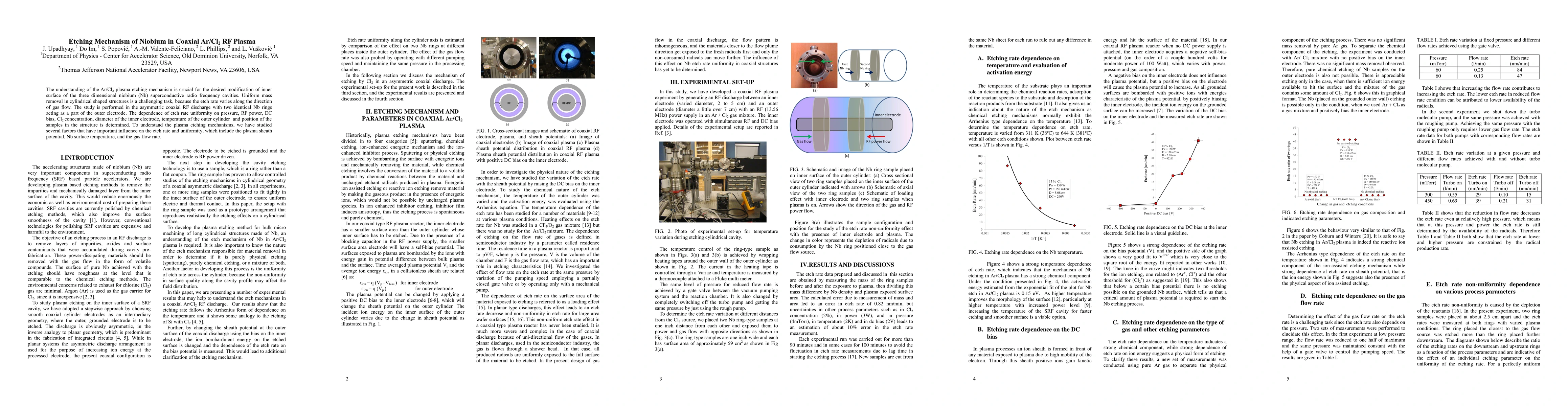This paper investigates the etching mechanism of niobium in an Ar/Cl2 RF plasma to achieve uniform mass removal in cylindrical structures, focusing on factors like pressure, RF power, and Cl2 concentration affecting etch rate and uniformity. The study uses an asymmetric coaxial RF discharge and analyzes plasma sheath potential, Nb surface temperature, and gas flow rate to understand the etching process.