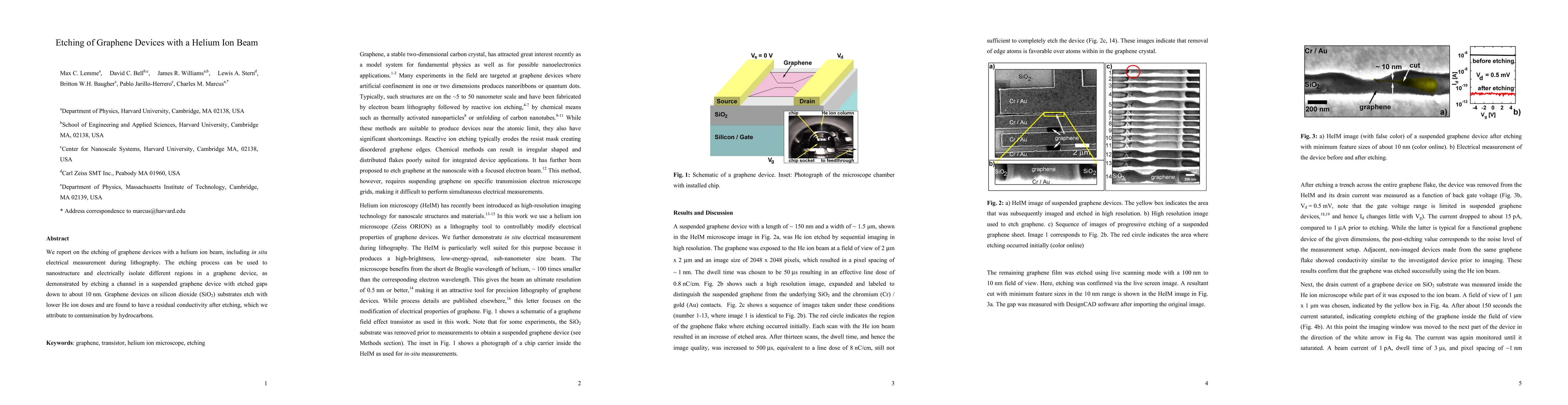 Summary: The research demonstrates the use of a helium ion beam for etching graphene devices, achieving nanostructuring and electrical isolation. Devices etched on SiO2 substrates show residual conductivity post-etch, likely due to hydrocarbon contamination.
