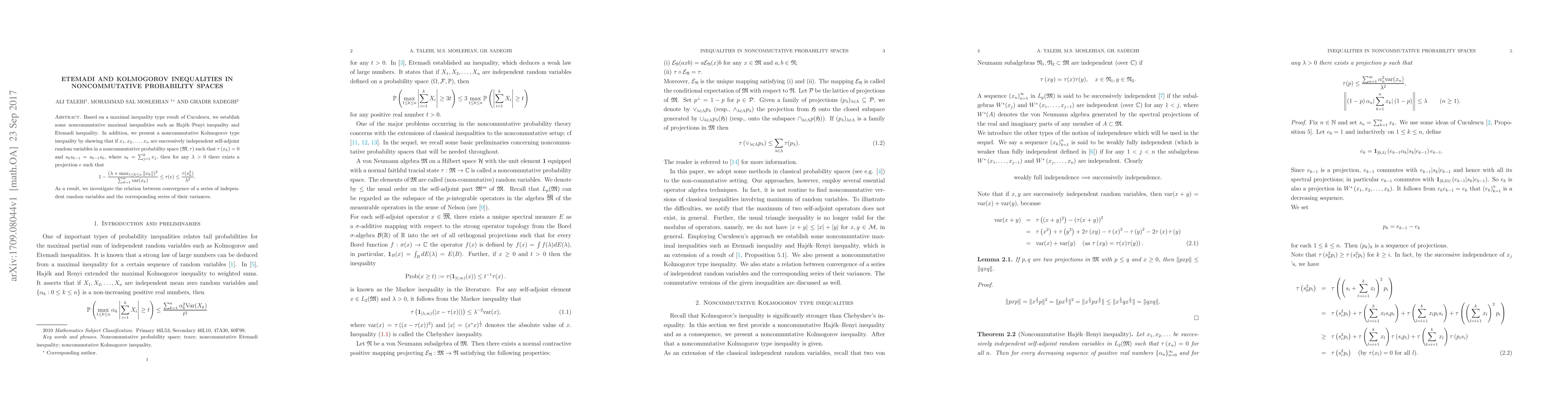 This paper establishes noncommutative versions of the Etemadi and Kolmogorov inequalities in noncommutative probability spaces, proving a maximal inequality and exploring the convergence of series of independent self-adjoint random variables relative to their variances.