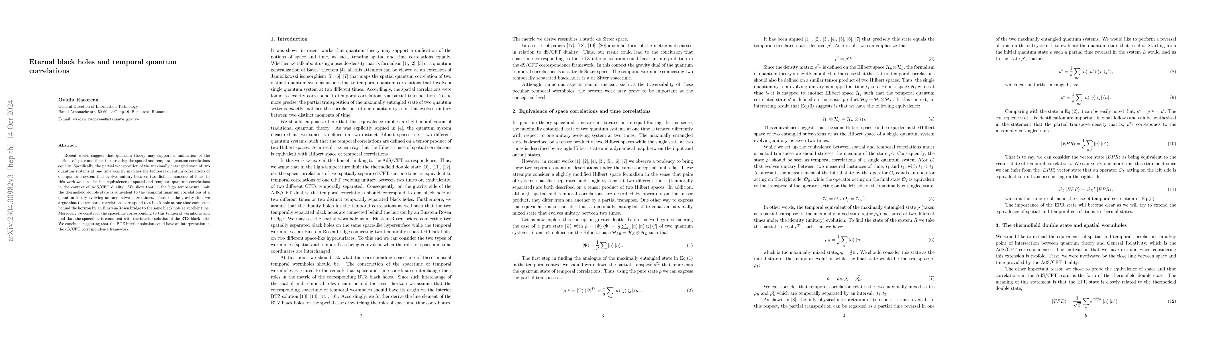 This paper explores the equivalence of spatial and temporal correlations in quantum theory, particularly in the context of the AdS/CFT correspondence. It proposes that the thermofield double state represents temporal correlations, analogous to a black hole connected by an Einstein-Rosen bridge, with the AdS-Schwarzschild black hole's interior solution representing the spacetime of this temporal wormhole.