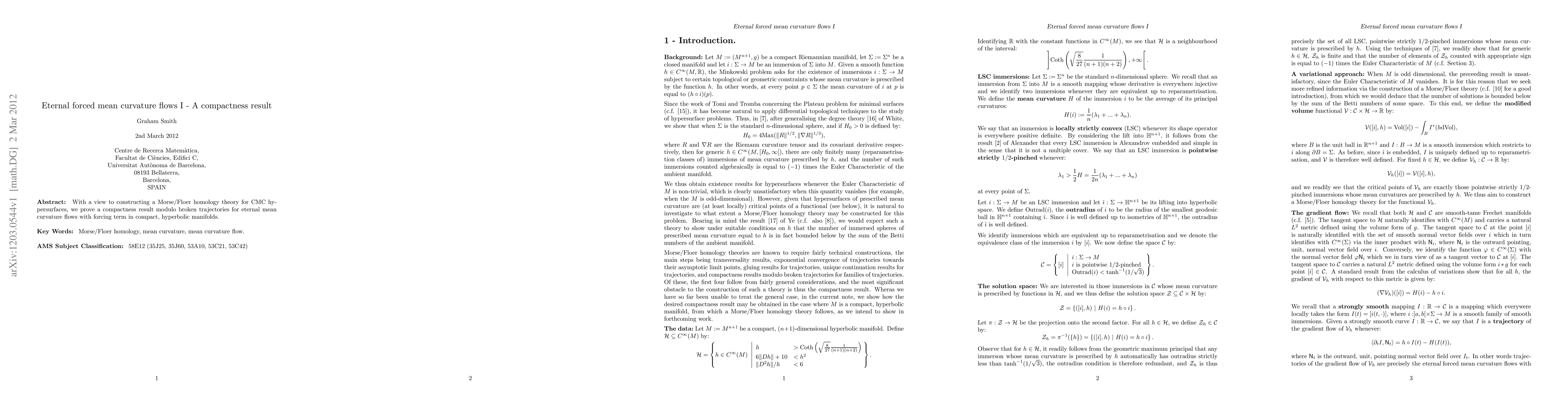 This paper establishes a compactness result for eternal mean curvature flows with a forcing term in compact hyperbolic manifolds, laying the groundwork for constructing a Morse/Floer homology theory for constant mean curvature (CMC) hypersurfaces. The result holds modulo broken trajectories.
