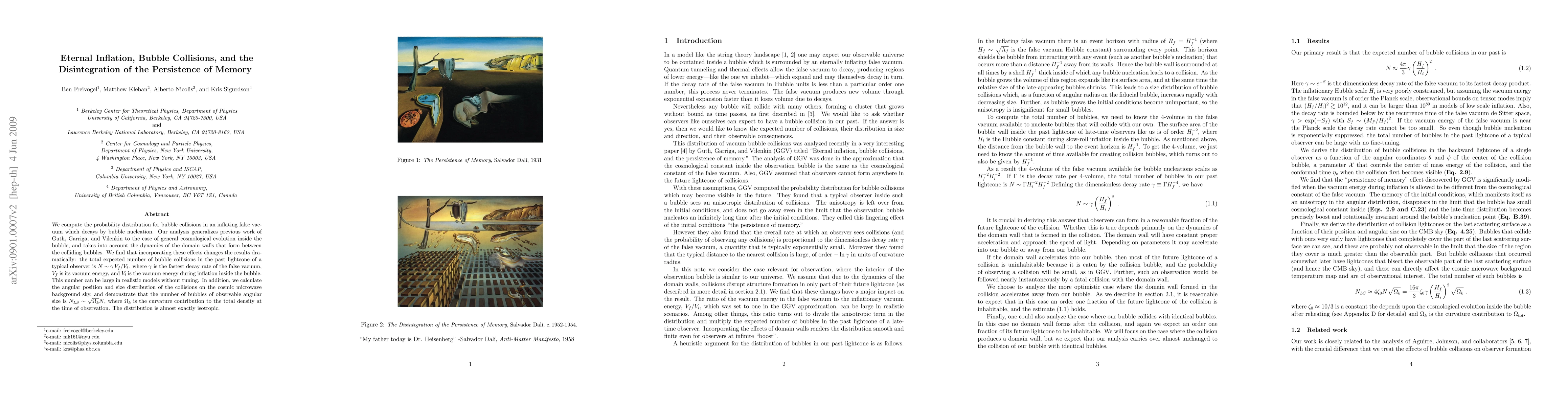 We compute the probability distribution for bubble collisions in an inflating false vacuum which decays by bubble nucleation. Our analysis generalizes previous work of Guth, Garriga, and Vilenkin to the case of general cosmological evolution inside the bubble, and takes into account the dynamics of the domain walls that form between the colliding bubbles. We find that incorporating these effects changes the results dramatically: the total expected number of bubble collisions in the past lightcone of a typical observer is N ~ \gamma V_f / V_i, where \gamma is the fastest decay rate of the false vacuum, V_f is its vacuum energy, and V_i is the vacuum energy during inflation inside the bubble. This number can be large in realistic models without tuning. In addition, we calculate the angular position and size distribution of the collisions on the cosmic microwave background sky, and demonstrate that the number of bubbles of observable angular size is N_{LS} \sim \sqrt{\Omega_k} N, where \Omega_k is the curvature contribution to the total density at the time of observation. The distribution is almost exactly isotropic.