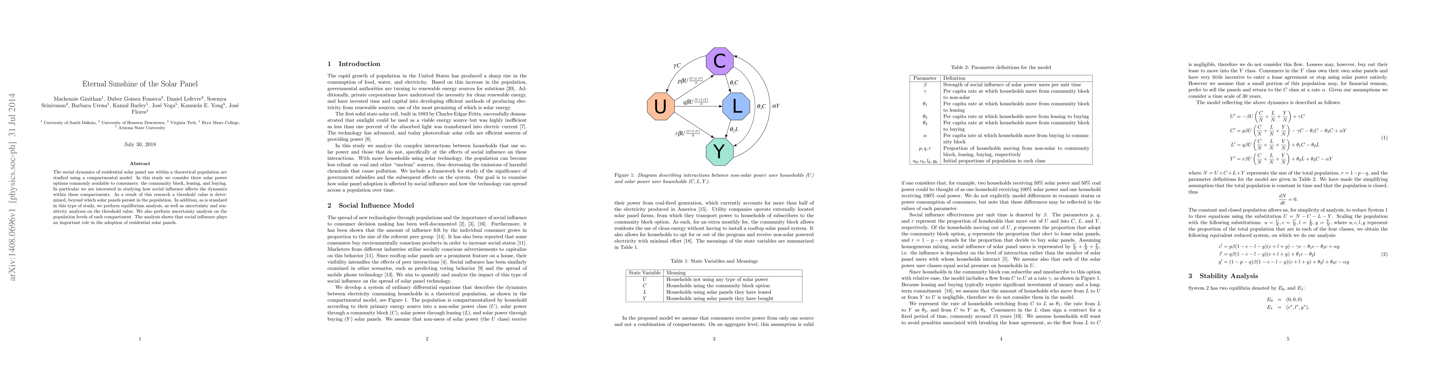 The social dynamics of residential solar panel use within a theoretical population are studied using a compartmental model. In this study we consider three solar power options commonly available to consumers: the community block, leasing, and buying. In particular we are interested in studying how social influence affects the dynamics within these compartments. As a result of this research a threshold value is determined, beyond which solar panels persist in the population. In addition, as is standard in this type of study, we perform equilibrium analysis, as well as uncertainty and sensitivity analyses on the threshold value. We also perform uncertainty analysis on the population levels of each compartment. The analysis shows that social influence plays an important role in the adoption of residential solar panels.