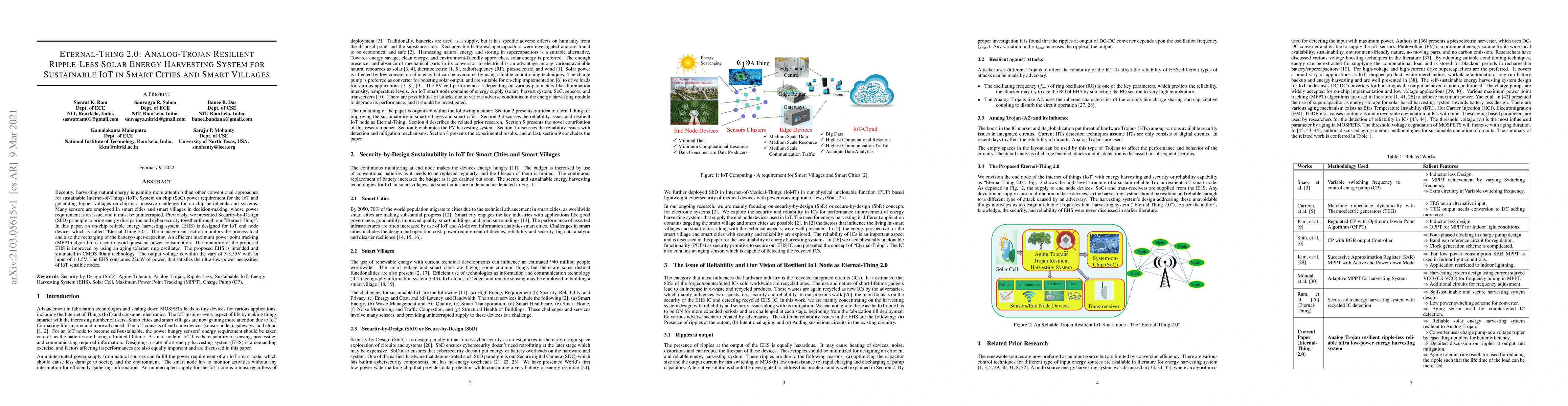 Recently, harvesting natural energy is gaining more attention than other conventional approaches for sustainable Internet-of-Things (IoT). System on chip (SoC) power requirement for the IoT and generating higher voltages on-chip is a massive challenge for on-chip peripherals and systems. Many sensors are employed in smart cities and smart villages in decision-making, whose power requirement is an issue, and it must be uninterrupted. Previously, we presented Security-by-Design (SbD) principle to bring energy dissipation and cybersecurity together through our "Eternal-Thing". In this paper, an on-chip reliable energy harvesting system (EHS) is designed for IoT end node devices which is called "Eternal-Thing 2.0". The management section monitors the process load and also the recharging of the battery or super-capacitor. An efficient maximum power point tracking (MPPT) algorithm is used to avoid quiescent power consumption. The reliability of the proposed EHS is improved by using an aging tolerant ring oscillator. The proposed EHS is intended and simulated in CMOS 90nm technology. The output voltage is within the vary of 3-3.55V with an input of 1-1.5V. The EHS consumes 22 micro Watt of power, that satisfies the ultra-low-power necessities of IoT sensible nodes.