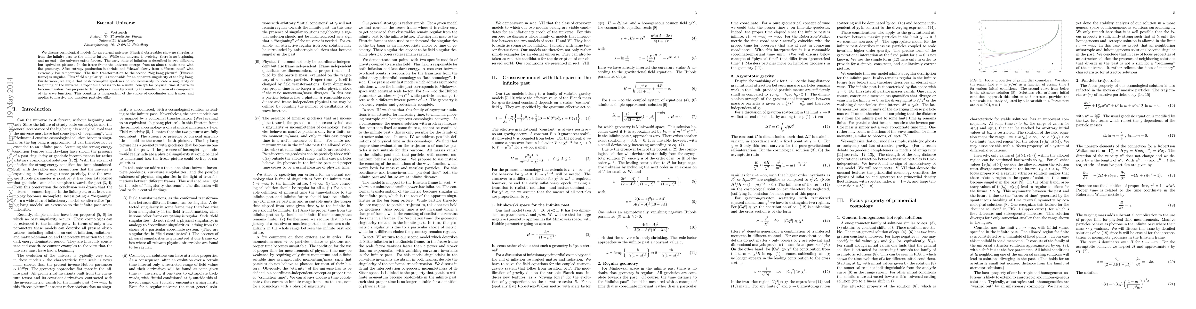 We discuss cosmological models for an eternal universe. Physical observables show no singularity from the infinite past to the infinite future. While the universe is evolving, there is no beginning and no end - the universe exists forever. The early state of inflation is described in two different, but equivalent pictures. In the freeze frame the universe emerges from an almost static state with flat geometry. After entropy production it shrinks and "thaws" slowly from a "freeze state" with extremely low temperature. The field transformation to the second "big bang picture" (Einstein frame) is singular. This "field singularity" is responsible for an apparent singularity of the big bang. Furthermore, we argue that past-incomplete geodesics do not necessarily indicate a singularity or beginning of the universe. Proper time ceases to be a useful concept for physical time if particles become massless. We propose to define physical time by counting the number of zeros of a component of the wave function. This counting is independent of the choice of coordinates and frames, and applies to massive and massless particles alike.