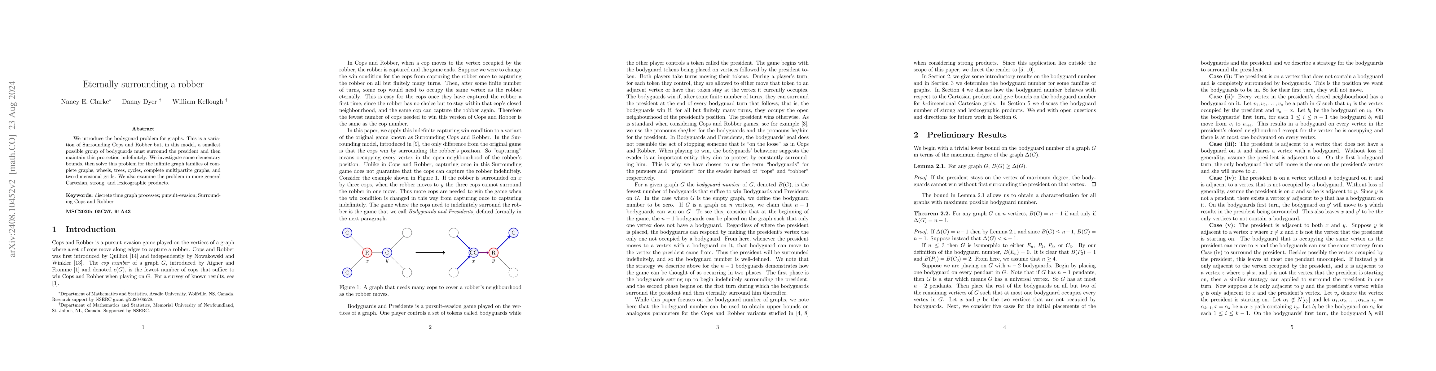 This paper introduces the bodyguard problem for graphs, a variant of the Surrounding Cops and Robber game where a minimal group of bodyguards must indefinitely protect a president. The authors provide solutions and bounds for this problem in several infinite graph families including complete graphs, wheels, trees, cycles, complete multipartite graphs, and two-dimensional grids, as well as in Cartesian, strong, and lexicographic graph products.