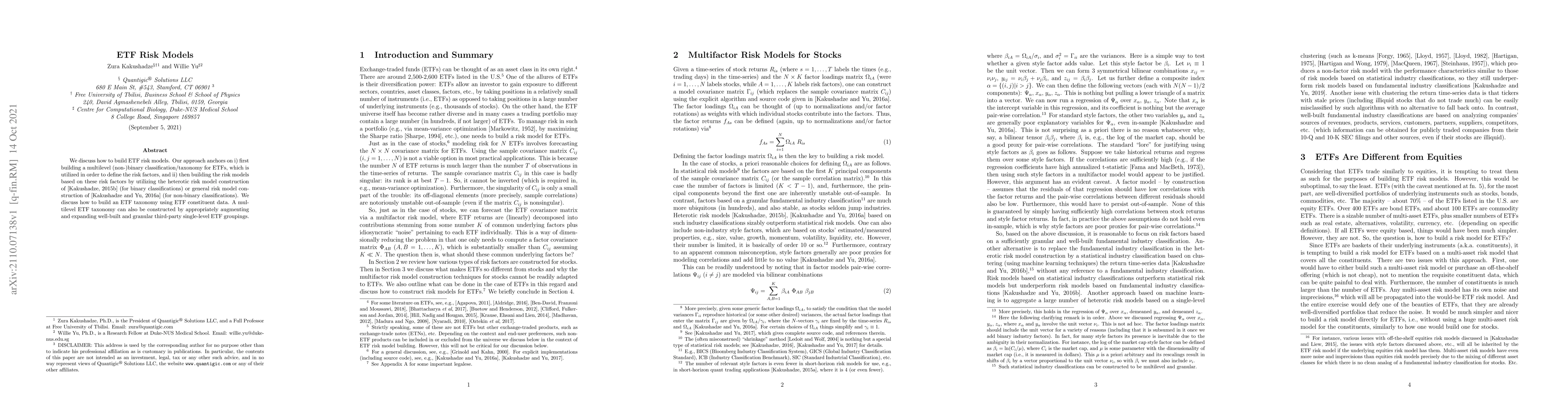 We discuss how to build ETF risk models. Our approach anchors on i) first building a multilevel (non-)binary classification/taxonomy for ETFs, which is utilized in order to define the risk factors, and ii) then building the risk models based on these risk factors by utilizing the heterotic risk model construction of https://ssrn.com/abstract=2600798 (for binary classifications) or general risk model construction of https://ssrn.com/abstract=2722093 (for non-binary classifications). We discuss how to build an ETF taxonomy using ETF constituent data. A multilevel ETF taxonomy can also be constructed by appropriately augmenting and expanding well-built and granular third-party single-level ETF groupings.