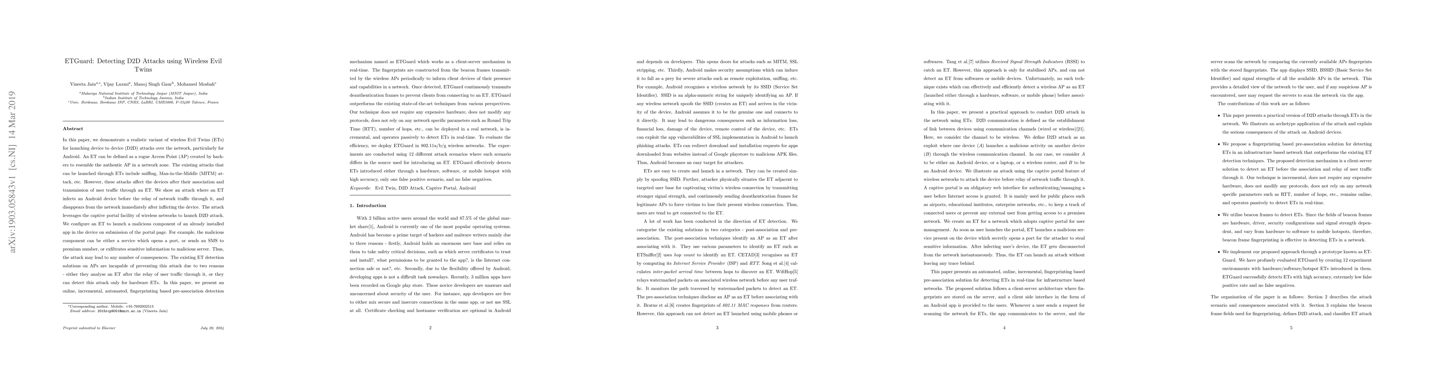 ETGuard is an online, incremental detection mechanism for wireless Evil Twins (ETs) that leverages fingerprinting from beacon frames to identify and prevent D2D attacks on Android devices. It outperforms existing techniques by operating passively, requiring no hardware modifications or network-specific parameters, and achieving high detection accuracy with minimal false positives.