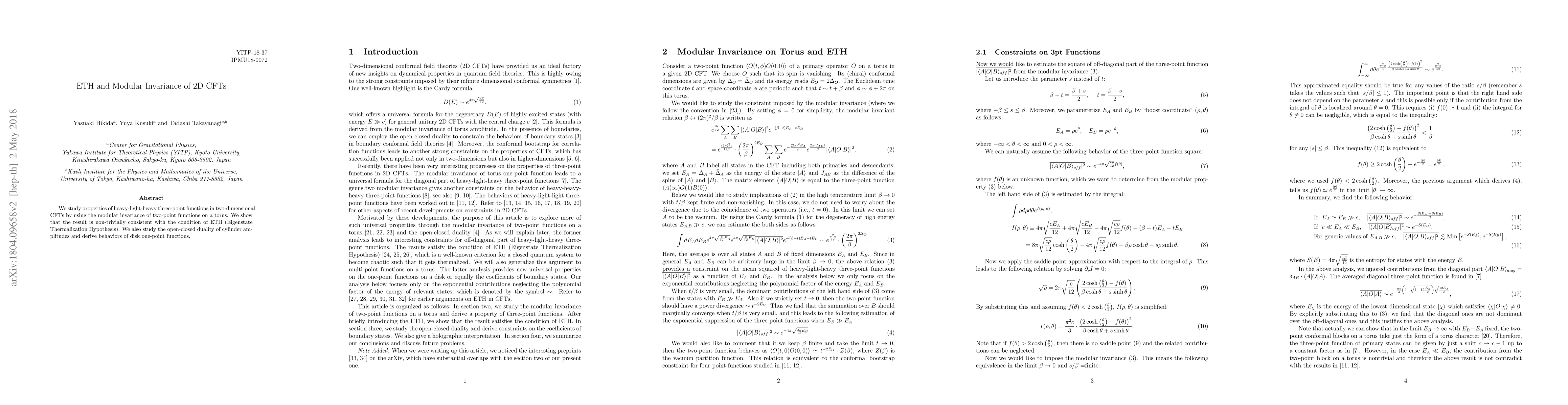 This paper investigates the modular invariance of two-dimensional conformal field theories (CFTs) and demonstrates its consistency with the Eigenstate Thermalization Hypothesis (ETH) through heavy-light-heavy three-point functions. It also explores the open-closed duality in cylinder amplitudes and examines the behaviors of disk one-point functions.