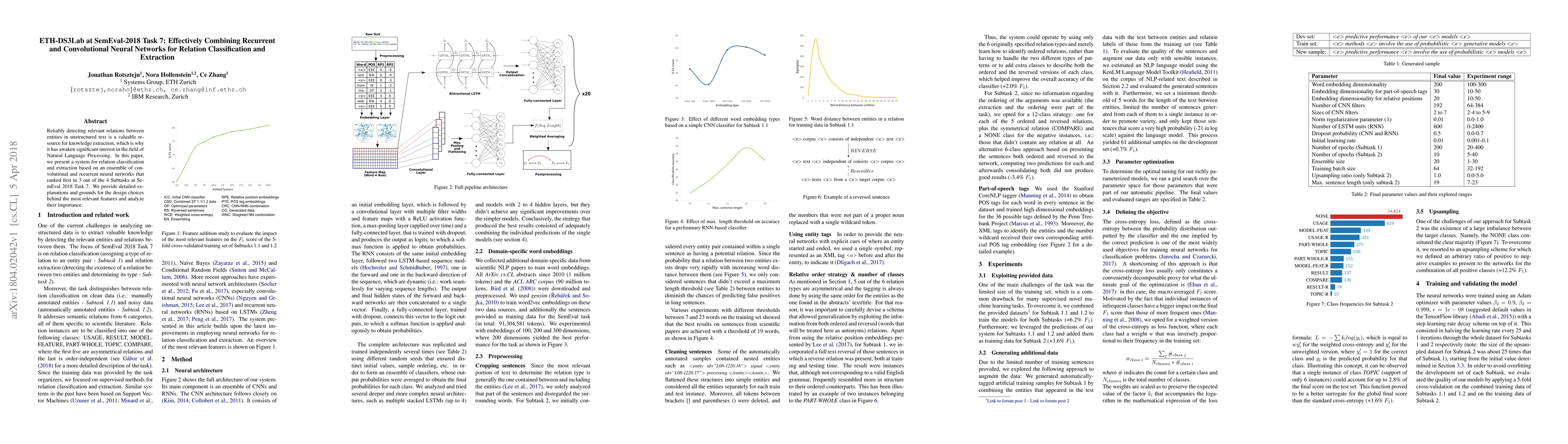 Title: ETH-DS3Lab at SemEval-2018 Task 7: Effectively Combining Recurrent and Convolutional Neural Networks for Relation Classification and Extraction Summary: This paper introduces a system combining convolutional and recurrent neural networks for relation classification and extraction, achieving top rankings in three out of four subtasks at SemEval 2018 Task 7, with detailed analysis of feature design and importance.