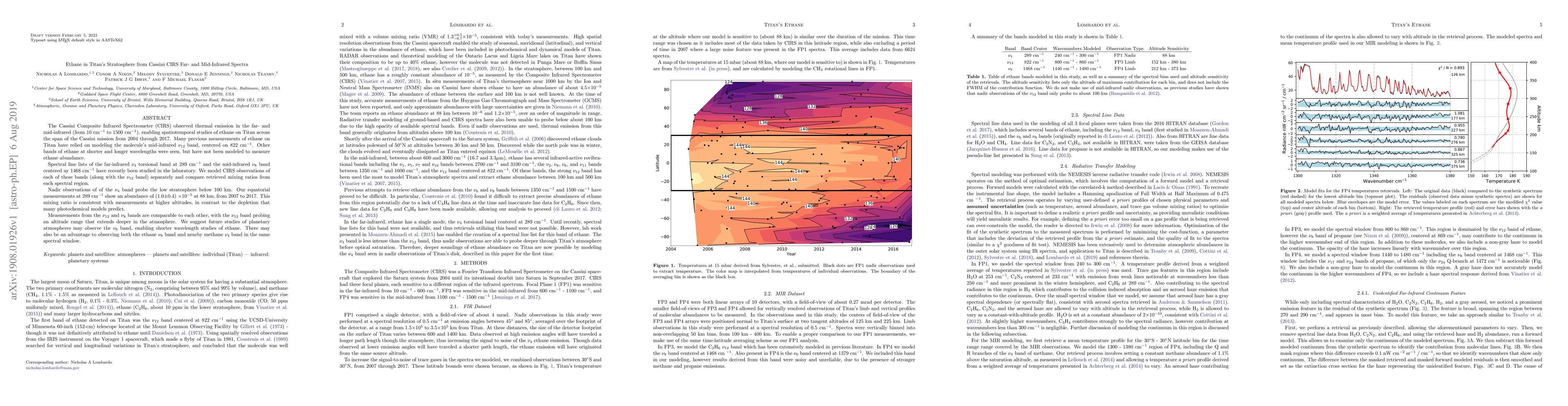 The Cassini CIRS spectrometer detected ethane in Titan's stratosphere using far- and mid-infrared spectra, revealing an abundance of (1.0±0.4)×10$^{-5}$ at 88 km from 2007 to 2017, consistent across different spectral bands and contrary to photochemical model predictions. Future studies may benefit from observing the $\nu_{8}$ band for ethane and the $\nu_{4}$ band for methane.