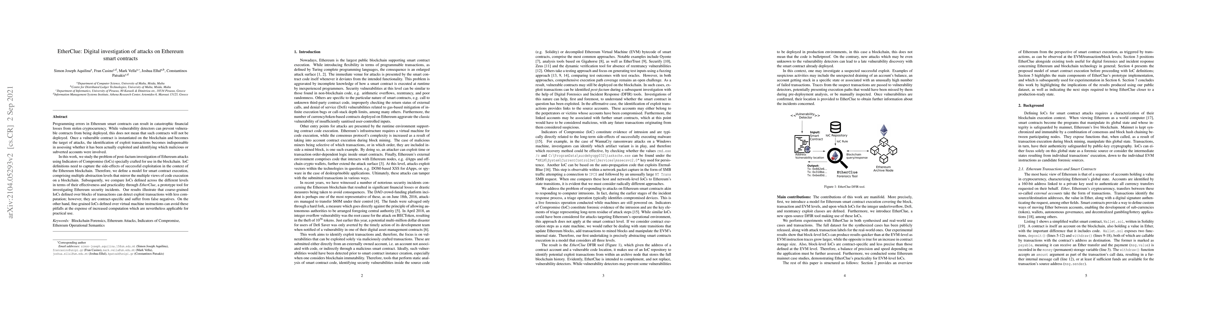 This paper investigates the post-factum analysis of attacks on Ethereum smart contracts using Indicators of Compromise (IoCs) tailored for blockchain. The study proposes a model for smart contract execution across multiple abstraction levels and evaluates the effectiveness of coarse-grained and fine-grained IoCs through a prototype tool called EtherClue, finding that while coarse-grained IoCs require less computation, they are contract-specific and prone to false negatives, whereas fine-grained IoCs offer better accuracy but at a higher computational cost.