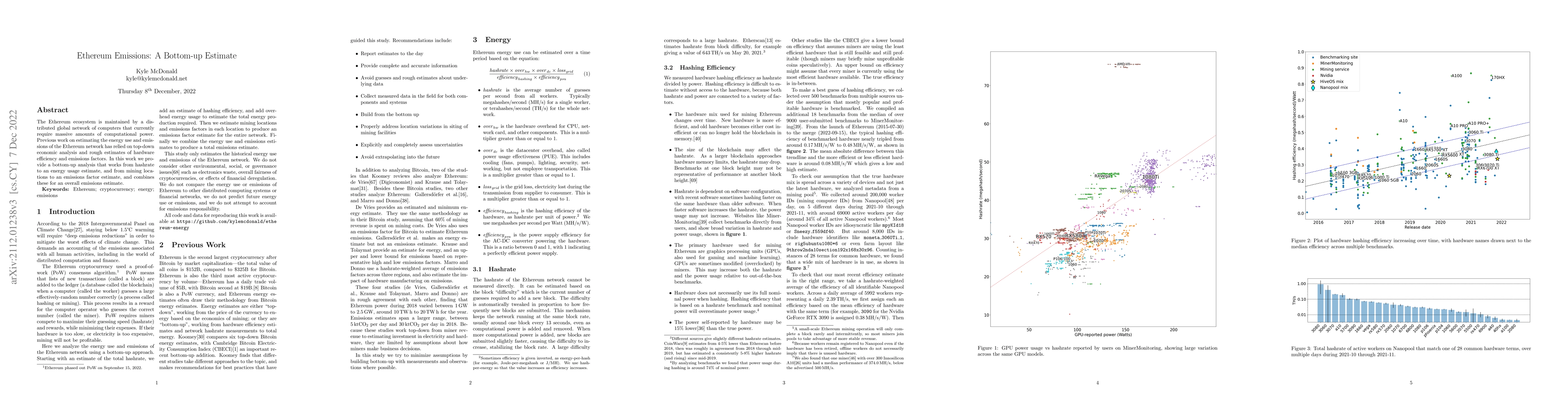 This paper presents a bottom-up analysis of Ethereum's emissions by estimating energy use from hashrate and emissions from mining locations, providing a comprehensive estimate from creation to the merge of the PoW Ethereum network. It contrasts with previous top-down economic analyses.