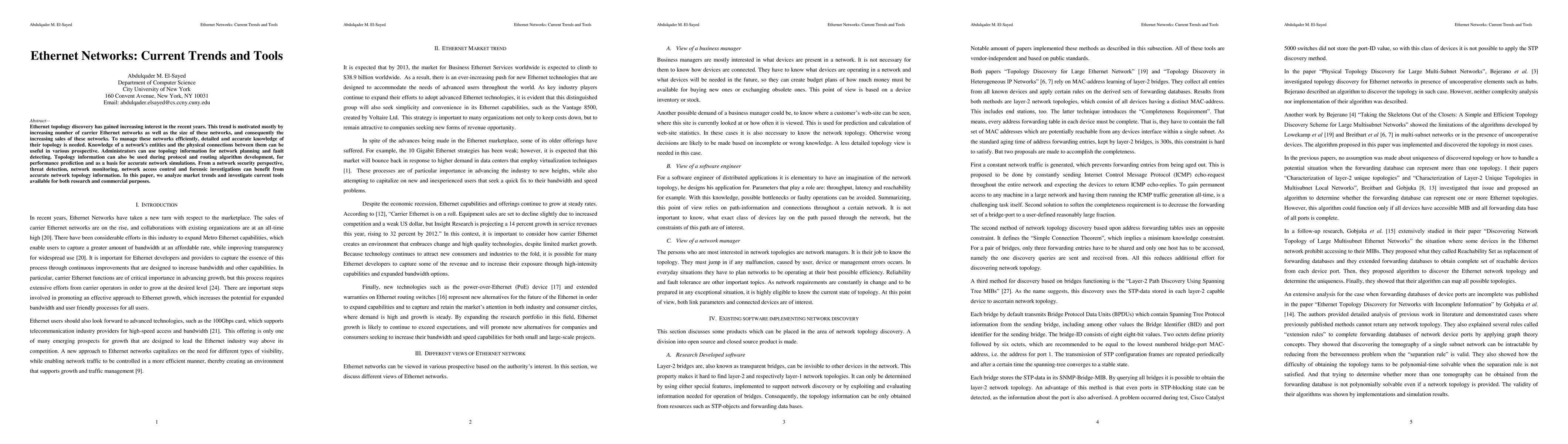 Ethernet topology discovery has gained increasing interest in the recent years. This trend is motivated mostly by increasing number of carrier Ethernet networks as well as the size of these networks, and consequently the increasing sales of these networks. To manage these networks efficiently, detailed and accurate knowledge of their topology is needed. Knowledge of a network's entities and the physical connections between them can be useful in various prospective. Administrators can use topology information for network planning and fault detecting. Topology information can also be used during protocol and routing algorithm development, for performance prediction and as a basis for accurate network simulations. From a network security perspective, threat detection, network monitoring, network access control and forensic investigations can benefit from accurate network topology information. In this paper, we analyze market trends and investigate current tools available for both research and commercial purposes.